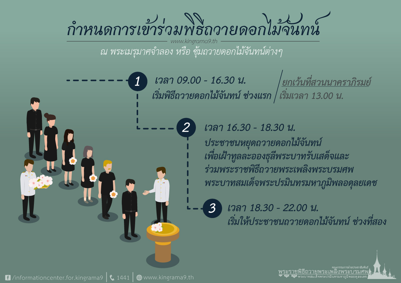 Info Graphic แนะนำการเตรียมความพร้อมก่อนร่วมพิธีถวายดอกไม้จันทร์ งานพระราชพิธีถวายพระเพลิงพระบรมศพพระบาทสมเด็จพระปรมินทรมหาภูมิพลอดุลยเดช
