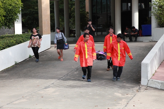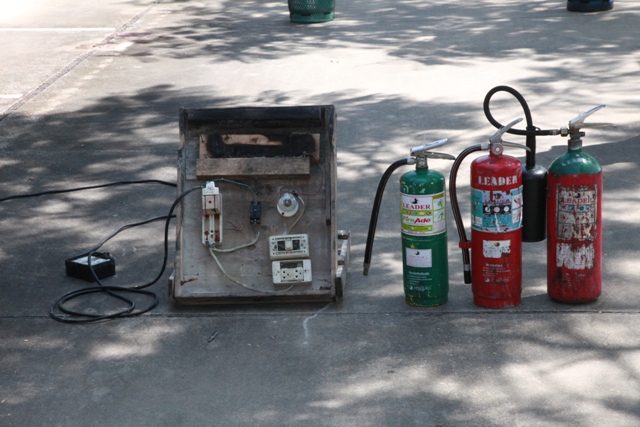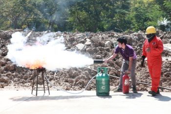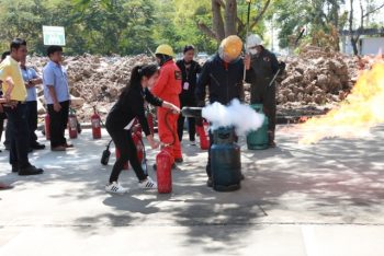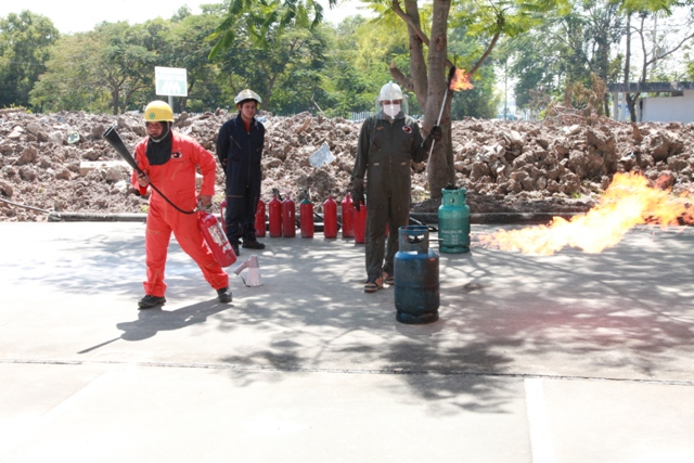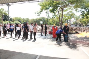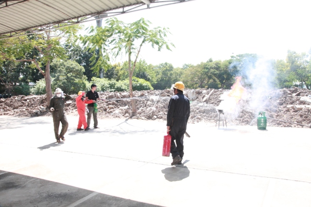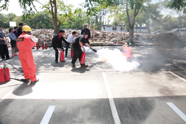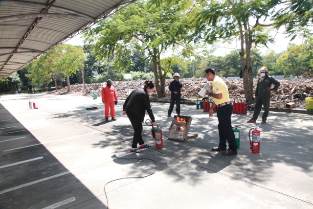 - พนักงาน มว. ฝึกวิธีการดับเพลิงจากอุปกรณ์จริง