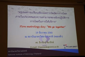 นายอนุสรณ์ ทนหมื่นไวย ผู้ช่วยผู้อำนวยการ มว. เป็นประธานในพิธีเปิดการประชุมวิชาการ 2560 Flow Metrology Day “We go together” โดยในงานนี้ได้จัดให้มีการบรรยายโดยวิทยากรผู้ทรงคุณวุฒิหลายท่านทั้งจากภายในประเทศและต่างประเทศ และจากหลากหลายห่วยงานด้วยกัน วัตถุประสงค์ของการจัดงานในครั้งนี้เพื่อนำเสนอความสามารถทางการวัดของห้องปฏิบัติการการไหลในประเทศ และเป็นเวทีในการถ่ายทอดและแลกเปลี่ยนความรู้ทางการวัด ระหว่างบุคลากรของสถาบันมาตรวิทยาแห่งชาติ องค์กรของภาครัฐ ภาคเอกชน และห้องปฏิบัติการในประเทศ ณ อาคารสำนักงานกลาง มว. จ.ปทุมธ่านี