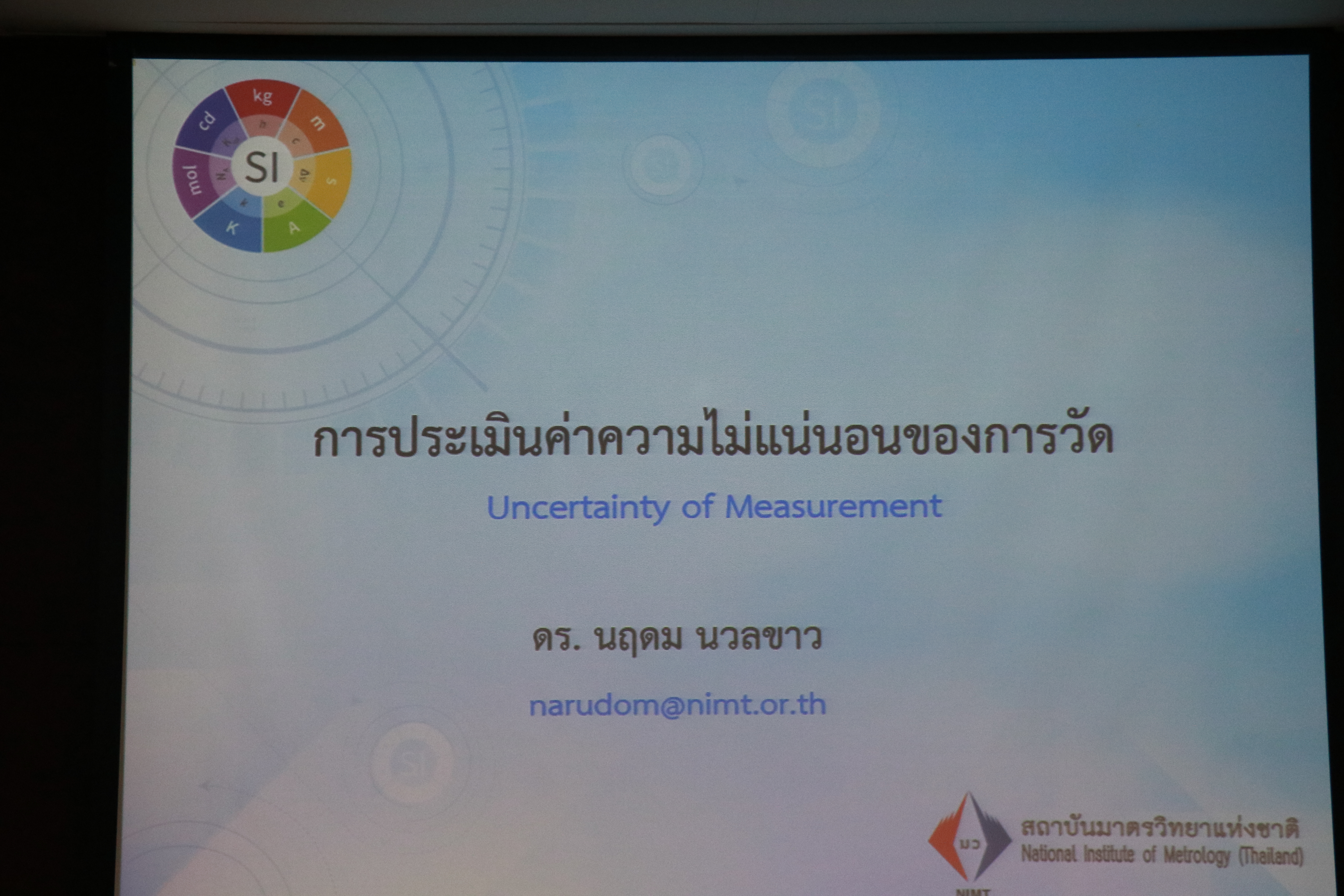 ส่วนฝึกอบรม กลุ่มงานพัฒนาธุรกิจ ฝ่ายนโยบายและยุทธศาสตร์ จัดอบรมประจำปีหัวข้อ การประเมินค่าความไม่แน่นอนของการวัด รุ่น 2 บรรยายให้ความรู้แก่ผู้เข้าอบรมที่สนใจจากหน่วยงานทั้งจากภาครัฐ เอกชน และอุตสาหกรรมโดย ดร.นฤดม นวลขาว พนักงานประสานงานอบรมชำนาญการ กลุ่มงานพัฒนาธุรกิจ ฝ่ายนโยบายและยุทธศาสตร์ โดยมีวัตถุประสงค์เพื่อให้ผู้เข้าอบรมได้เข้าใจแนวทางการประเมินความไม่แน่นอนของการวัดตาม Guide to the expression of Uncertainty of Measurement (GUM) สามารถนำความรู้ที่ได้ไปประยุกต์ใช้ในการรายงานผลการทดสอบและ/หรือผลการสอบเทียบของห้องปฏิบัติการ และเข้าใจการรายงานผลความไม่แน่นอนที่ระบุมากับใบรับรองการสอบเทียบ และสามารถนำไปใช้ได้อย่างถูกต้อง ณ อาคารสำนักงานกลาง และอาคารผดุงมาตร มว. จ.ปทุมธานี