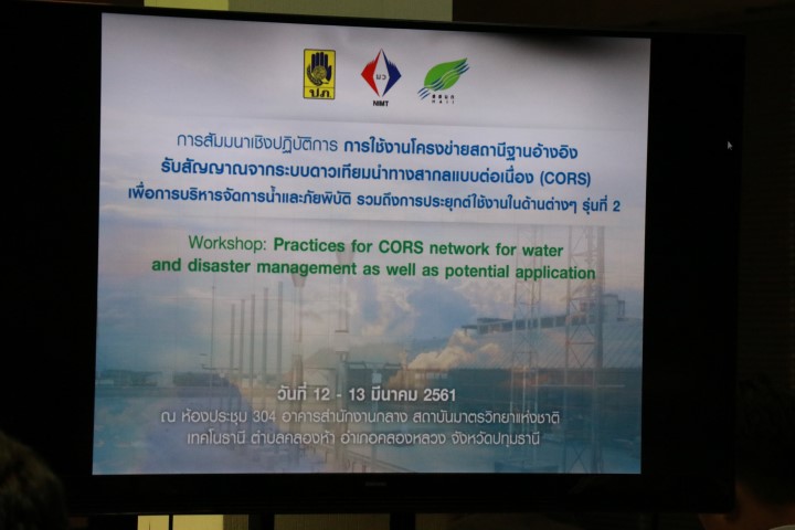 นางอัจฉรา เจริญสุข ผู้อำนวยการ มว. กล่าวต้อนรับ ดร.สุทัศน์ วีสกุล ผู้อำนวยการสถาบันสารสนเทศทรัพยากรน้ำและการเกษตร (องค์การมหาชน) ในโอกาสเปิดงานสัมมนาเชิงปฏิบัติการ เรื่อง การใช้งานโครงข่ายสถานีฐานอ้างอิงรับสัญญาณจากระบบดาวเทียมนำทางสากลแบบต่อเนื่อง (CORS) เพื่อการบริหารจัดการน้ำและภัยพิบัติ รวมถึงการประยุกต์ใช้งานในด้านต่าง ๆ รุ่นที่ 2 ซึ่งโครงการจัดตั้งสถานีด้านพิกัดและระดับความสูงเพื่อประเมินความเสียหายในพื้นที่เสี่ยงภัย 6 สถานี เพื่อพัฒนาระบบโครงข่ายสถานีอ้างอิงด้านพิกัดและระดับความสุง โดยใช้เทคโนโลยีการสำรวจที่อ้างอิงกับหมุดหลักฐานอ้างอิงสำหรับพิกัดและเวลามาตรฐานของประเทศไทย ด้วยระบบดาวเทียมนำทาง GNSS เพื่อช่วยในการทำแผนที่เสี่ยงน้ำท่วม การทำรังวัดต่าง ๆ ที่มีความแม่นยำสูงได้มาตรฐาน สนับสนุนการประเมินความเสียหายจากพื้นที่น้ำท่วม ดำเนินการโดย กรมป้องกันและบรรเทาสาธารณภัย (ปภ.) และมีหน่วยสนับสนุนด้านเทคนิคและบุคลากรในการดำเนินการจากสถาบันสารสนเทศทรัพยากรรน้ำและการเกษตร (องค์การมหาชน) หรือ สสนก. และสถาบันมาตรวิทยาแห่งชาติ (มว.) ซึ่งบัดนี้โครงการดังกล่าวได้ติดตั้งสถานีโครงข่ายอ้างอิงด้านพิกัดและระดับความสูงครอบคลุมพื้นที่ภาคกลาง จำนวน 6 สถานี พร้อมที่จะให้บริการกับหน่วยงานที่เกี่ยวข้องเรียบร้อยแล้ว ได้แก่ ปราจีนบุรี ปทุมธานี (สถาบันมาตรวิทยาแห่งชาติ) สมุทรปราการ อ่างทอง ฉะเขิงเทรา และนครปฐม จึงได้มีการจัดสัมมนาเชิงปฏิบัติการขึ้น ซึ่งได้รับความสนใจจากทั้งภาคการศึกษาและเอกชนเป็นอย่างมาก ณ อาคารสำนักงานกลาง และอาคารผดุงมาตร มว. จ.ปทุมธานี