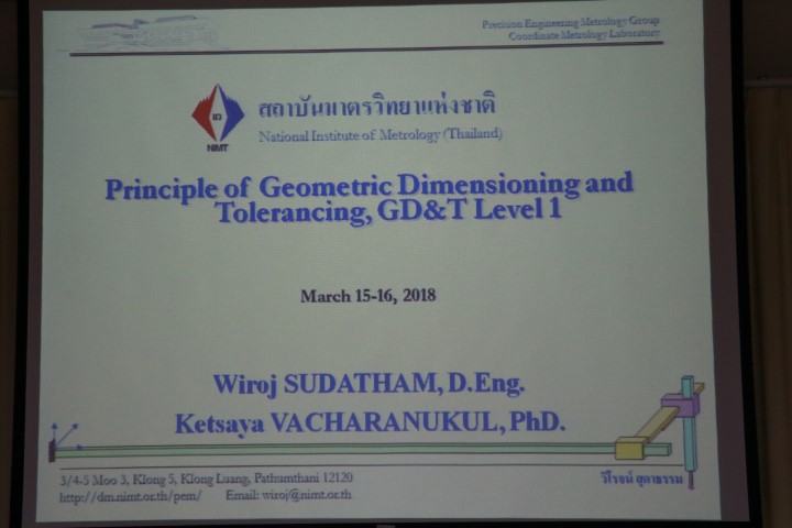 ส่วนฝึกอบรม กลุ่มงานพัฒนาธุรกิจ ฝ่ายนโยบายและยุทธศาสตร์ จัดอบรมประจำปีหัวข้อ หลักเกณฑ์ความคลาดเคลื่อนทางขนาดและเรขาคณิต (GD&T) ระดับ 1 บรรยายให้ความรู้แก่ผู้เข้าอบรมที่สนใจจากหน่วยงานทั้งจากภาครัฐ เอกชน และอุตสาหกรรม โดยดร.วิโรจน์ สุดาธรรม นักมาตรวิทยาชำนาญการ และดร.เกษญา วัชระนุกุล นักมาตรวิทยาชำนาญการพิเศษ รักษาการหัวหน้ากลุ่มงานวิศวกรรมการวัดละเอียด กลุ่มงานวิศวกรรมการวัดละเอียด ฝ่ายมาตรวิทยามิติ โดยมีวัตถุประสงค์เพื่อให้ผู้เข้าอบรมเข้าใจมาตรฐาน ISO 1101 และ ASME Y14.5 เข้าใจเกณฑ์ความเผื่อทางขนาดและเรขาคณิตสำหรับการออกแบบและการวัด และสามารถคำนวณและวิเคราะห์เกษฑ์ความเผื่อทางขนาดและเรขาคณิตได้ ณ อาคารสำนักงานกลาง มว. จ.ปทุมธานี