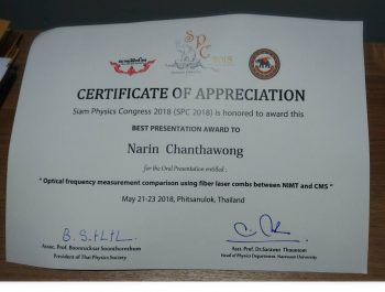 ภาควิชาฟิสิกส์ คณะวิทยาศาสตร์ มหาวิทยาลัยนเรศวร ร่วมกับสมาคมฟิสิกส์ไทย จัดประชุมวิชาการระดับชาติ “Siam Physics Congress 2018 (SPC2018)” ระหว่างวันที่ 21-23 พฤษภาคม 2561 โดยมีวัตถุประสงค์เพื่อเป็นเวทีในการแลกเปลี่ยนความคิดเห็นด้านฟิสิกส์และสาขาที่เกี่ยวข้อง และเพื่อเปิดโอกาสให้นักวิชาการ นักวิจัย อาจารย์ นิสิต นักศึกษา ได้เผยแพร่ผลงานวิจัยแลกเปลี่ยนความรู้และสร้างเครือข่ายทางวิชาการร่วมกัน โดยในงานนี้ ดร.นรินทร์ จันทวงศ์ นักมาตรวิทยา กลุ่มงานมาตรวิทยานาโน ฝ่ายมาตรวิทยามิติ ได้เข้ารับรางวัล Best Presentation Award .ในการบรรยายภายใต้หัวข้อ “Optical frequency measurement comparison using fiber laser combs between NIMT and CMS” ณ โรงแรมท๊อปแลนด์ จ.พิษณุโลก