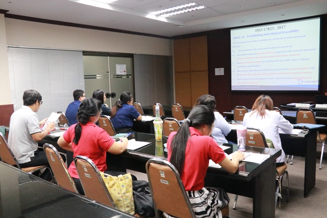 มว. จัดอบรมประจำปี 61 ภายใต้หัวข้อ การสอบกลับได้ทางมาตรวิทยาของผลการวัดทางเคมี โดยดร.กิตติยา เชียร์แมน นักมาตรวิทยาชำนาญการพิเศษ และ ดร.สุทธินันท์ แต่บรรพกุล นักมาตรวิทยาชำนาญการ ห้องปฏิบัติการวิเคราะห์อินทรีย์เคมี กลุ่มงานวิเคราะห์อินทรีย์เคมี ฝ่ายมาตรวิทยาเคมีและชีวภาพ โดยมีวัตถุประสงค์เพื่อเข้าใจถึงความหมายของการสอบกลับได้ทางมาตรวิทยาของผลการวัดทางเคมีและบอกถึงความสำคัญของการสอบกลับได้ทางมาตรวิทยาของผลการวัดทางเคมี ทั้งสามารถอธิบายการสอบกลับได้ของผลการวัดในห้องปฏิบัติการของตัวเองได้ ณ อาคารสำนักงานกลาง มว. จ.ปทุมธานี