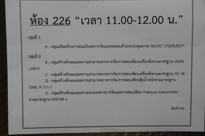 - A กลุ่มที่ 1 : กลุ่มเสริมสร้างการยอมรับผลการวัดและทดสอบด้วยระบบคุณภาพ ISO/IEC 17025: 2017 B กลุ่มที่ 2 กลุ่มสร้างทักษะและความสามารถทางการวัด/การสอบเทียบเครื่องชั่ง ตามมาตรฐาน UKAS LAB14 C กลุ่มที่ 2 กลุ่มสร้างทักษะและความสามารถทางการวัด/การสอบเทียบเครื่องชั่ง ตามมาตรฐาน CG 18 และ D กลุ่มที่ 2 กลุ่มสร้างทักษะและความสามารถทางการวัด/การสอบเทียบตุ้มน้ำหนักตามมาตรฐาน OIML R111-1