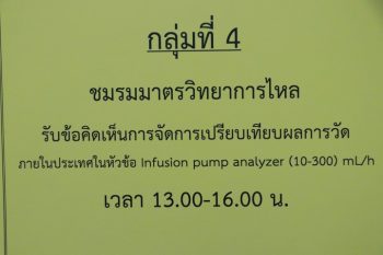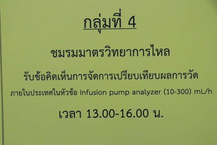 - กลุ่มที่ 4 ชมรมมาตรวิทยาการไหล รับฟังความคิดเห็นการจัดการเปรียบเทียบผลการวัดภายในประเทศในหัวข้อ Infusion pump analyzer (10-300)) mL/h