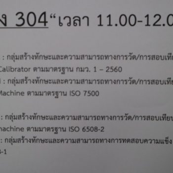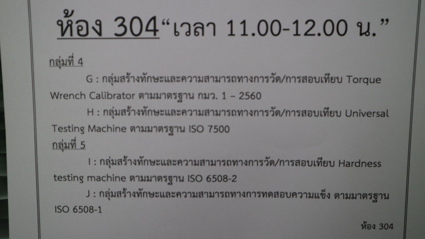 - H กลุ่มที่ 4 กลุ่มสร้างทักษะและความสามารถทางการวัด/การสอบเทียบ Universal Testing Machine ตามมาตรฐาน ISO 7500 & กลุ่มที่ 5 กลุ่มสร้างทักษะและความสามารถทางการวัด/การสอบเทียบ Hardness testing machine ตามาตรฐาน ISO 6508-2 และกลุ่มสร้างทักษะและความสามารถทางการทดสอบความแข็ง ตามมาตรฐาน ISO 6508-1
