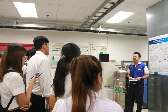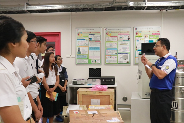 ดร.ชัยวัฒน์ เจษฎาจินต์ หัวหน้ากลุ่มงานมาตรฐานปฐมภูมิไฟฟ้า เวลาและความถี่ ให้การต้อนรับ ผศ.ดร.ณัฐพร พรหมรส และนักศึกษา จากคณะวิทยาศาสตร์ สถาบันเทคโนโลยีพระจอมเกล้าเจ้าคุณทหารลาดกระบัง ในโอกาสเข้าเยี่ยมชมห้องปฏิบัติการของสถาบัน โดยมีวัตถุประสงค์เพื่อให้นักศึกษาที่เรียนในรายวิชาการควบคุมคุณภาพ (Quality Control) หลักสูตรฟิสิกส์ประยุกต์ ได้เรียนรู้และเข้าใจการปฏิบัติงานจริง ณ อาคารผดุงมาตร มว. จ.ปทุมธานี