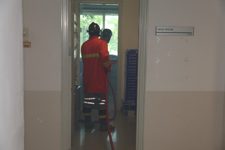 - เจ้าหน้าที่ลากสายน้ำดับเพลิง