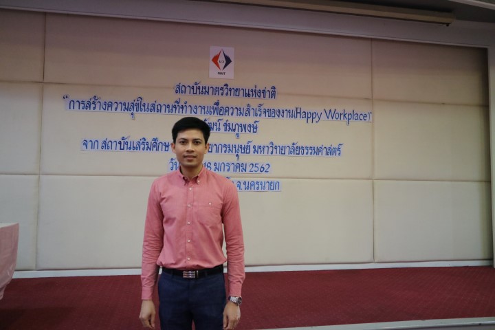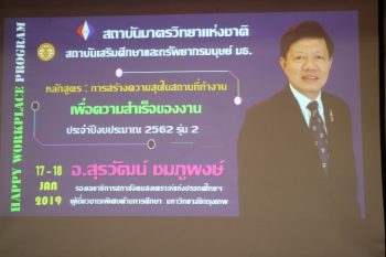 สถาบันมาตรวิทยาแห่งชาติ มว. ร่วมกับ สถาบันเสริมศึกษาและทรัพยามนุษย์ มหาวิทยาลัยธรรมศาสตร์ จัดอบรมหลักสูตร “การสร้างความสุขในสถานที่ทำงานเพื่อความสำเร็จของงาน (Happy Workplace)” รุ่น 2 บรรยายให้ความรู้แก่พนักงานของสถาบันโดย อ.สุรวัฒน์ ชมภูพงษ์ วิทยากร และ อ.จัตรตุพล ลามา เพิ่มวงษ์มาก ผู้ช่วยวิทยากร มีวัตถุประสงค์เพื่อพัฒนาบุคลากรของสถาบันให้ปฏิบัติงานได้อย่างมีความสุข เสริมสร้างสภาพแวดล้อมและบรรยากาศที่ดีในการทำงาน ซึ่งสถาบันถือเป็นนโยบายสำคัญ ณ ชลพฤกษ์รีสอร์ท จ.นครนายก