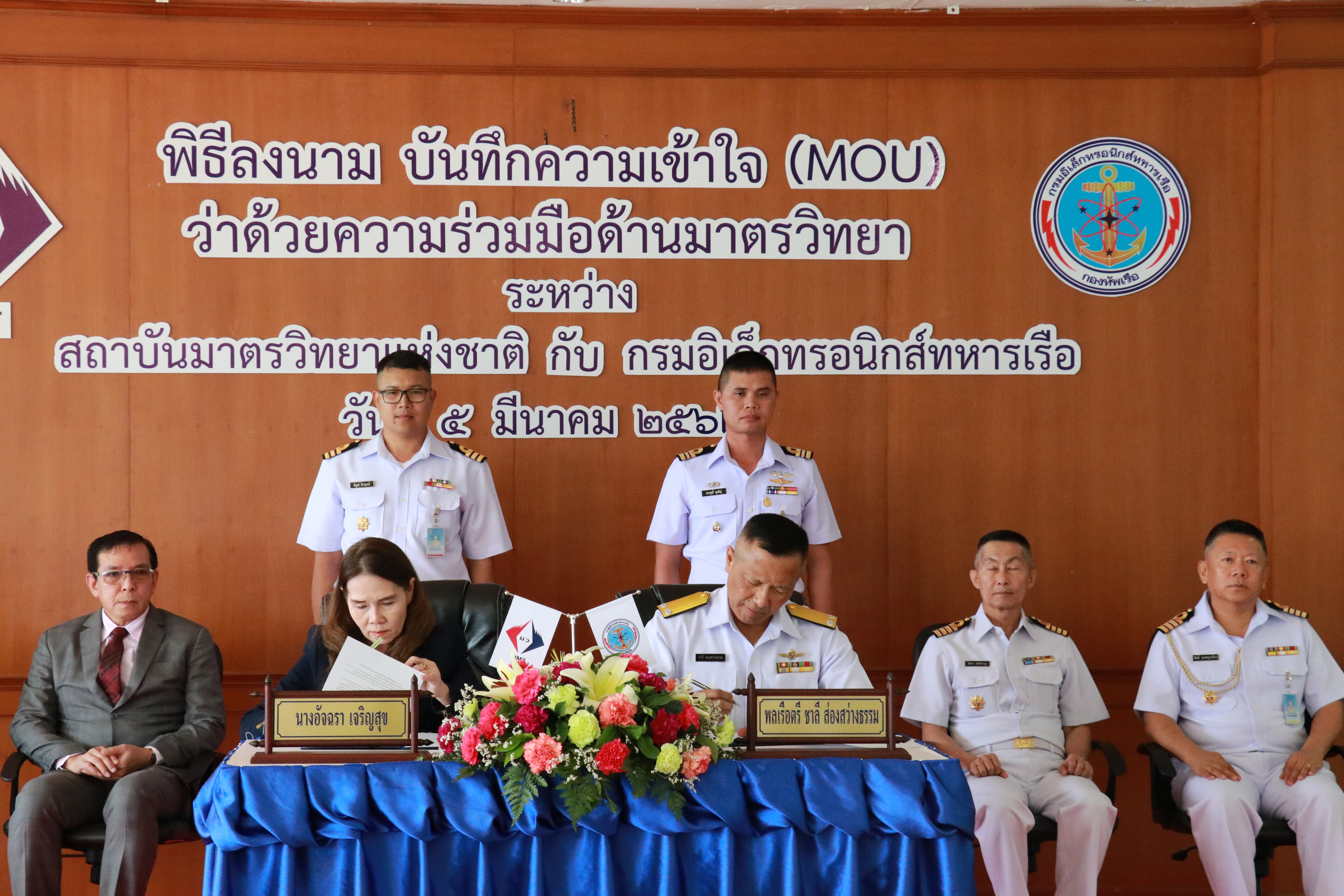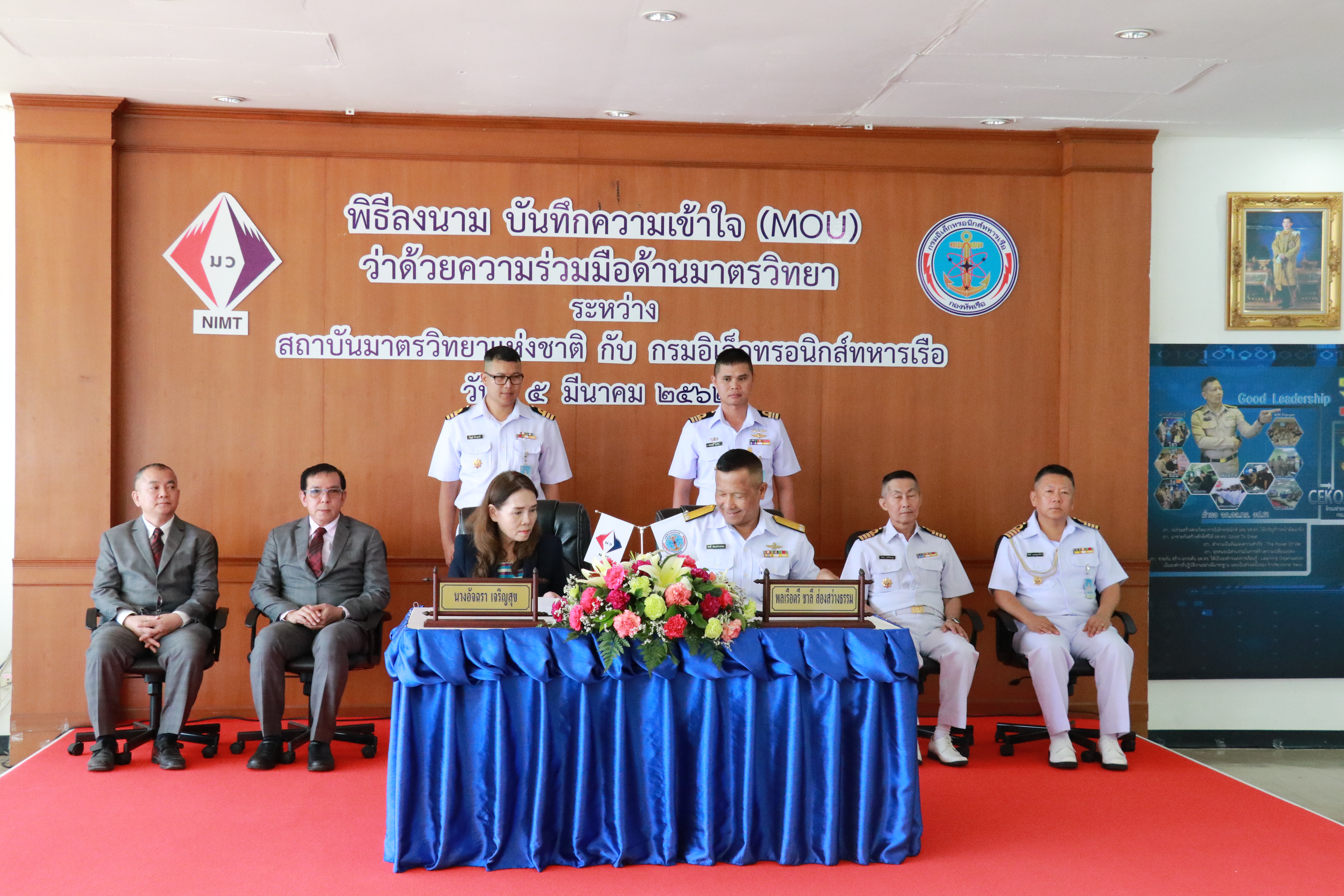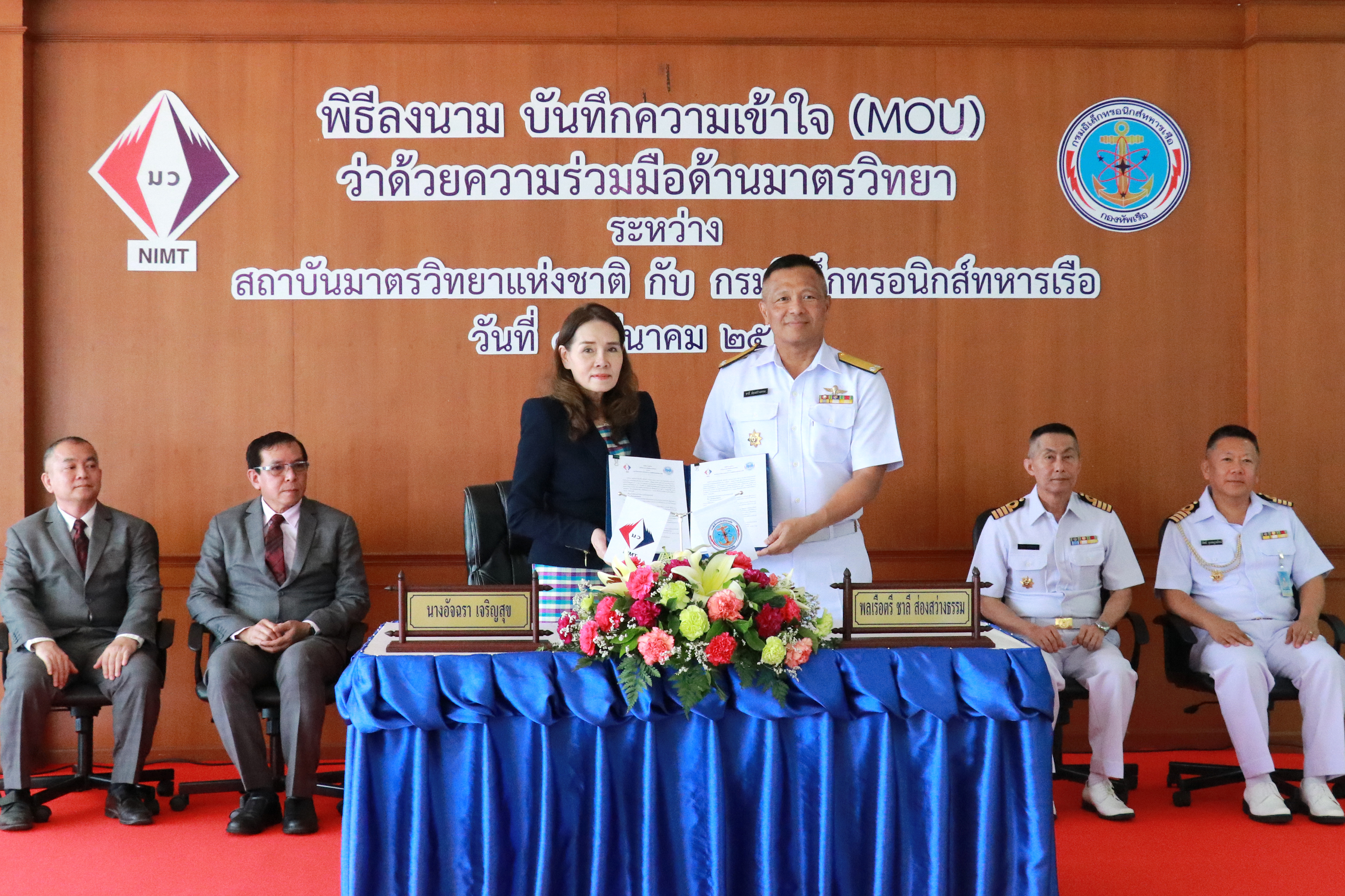 เมื่อวันอังคารที่ 5 มีนาคม 2562 นางอัจฉรา เจริญสุข ผู้อำนวยการสถาบันมาตรวิทยาแห่งชาติ (มว.) กระทรวงวิทยาศาสตร์และเทคโนโลยี และพลเรือตรี ชาลี ส่องสว่างธรรม เจ้ากรมอิเล็กทรอนิกส์ทหารเรือ กองทัพเรือ ร่วมลงนามบันทึกความเข้าใจว่าด้วยความร่วมมือด้านมาตรวิทยา ระหว่างสถาบันมาตรวิทยาแห่งชาติ กับกรมอิเล็กทรอนิกส์ทหารเรือ ณ กรมอิเล็กทรอนิกส์ทหารเรือ ฐานทัพเรือสัตหีบ จังหวัดชลบุรี ซึ่งการลงนามบันทึกความเข้าใจในครั้งนี้มีวัตถุประสงค์เพื่อร่วมกันพัฒนาองค์ความรู้ แลกเปลี่ยนความรู้และเทคโนโลยีด้านมาตรวิทยาในสาขาวิชาการอิเล็กทรอนิกส์ รวมถึงสนับสนุนห้องปฏิบัติการของกรมอิเล็กทรอนิกส์ทหารเรือ ให้เป็นที่ยอมรับในระดับสากล