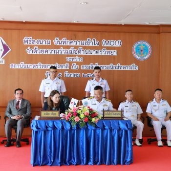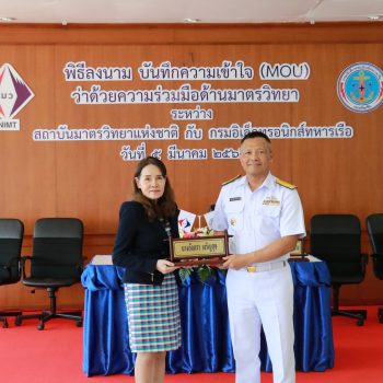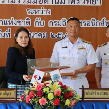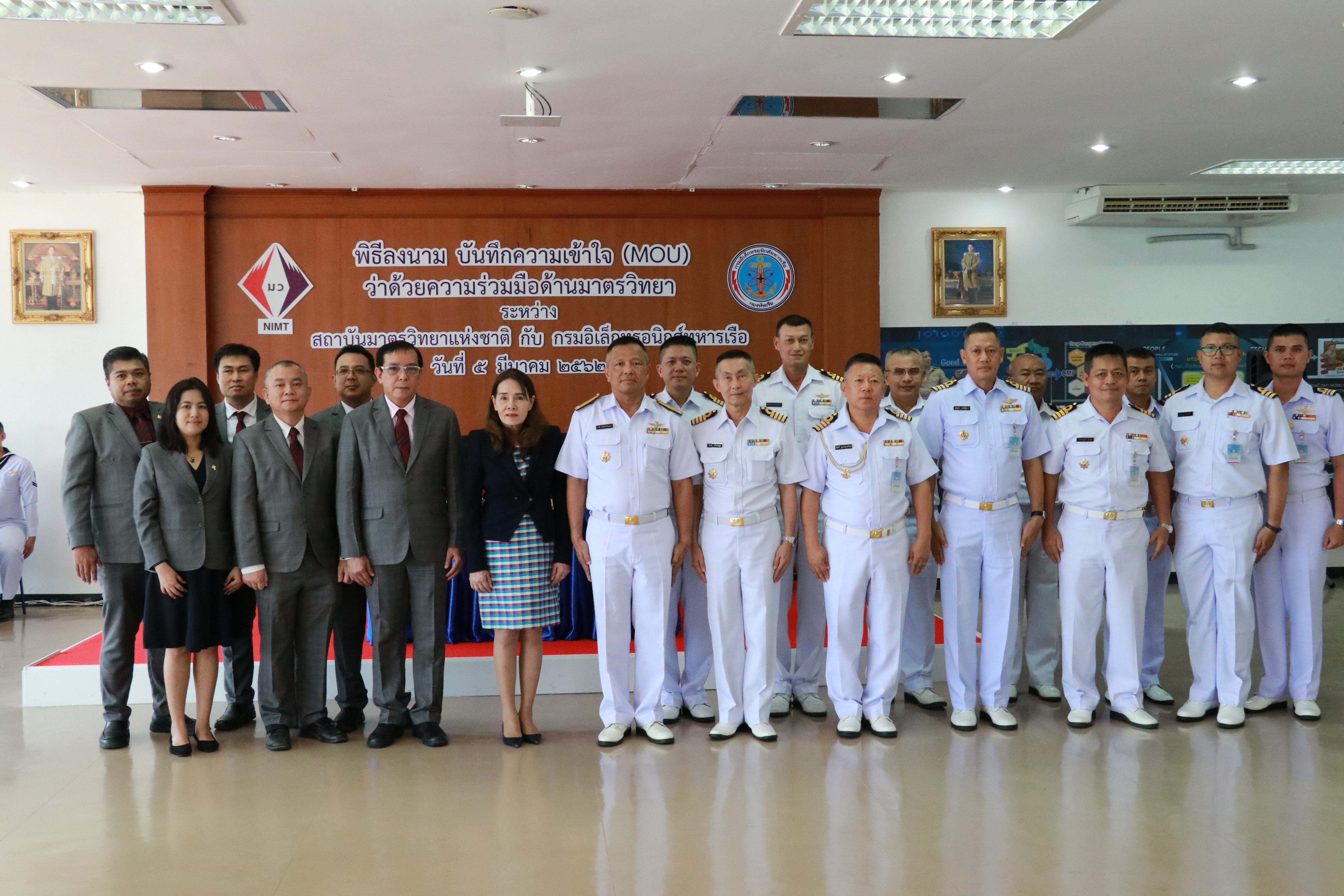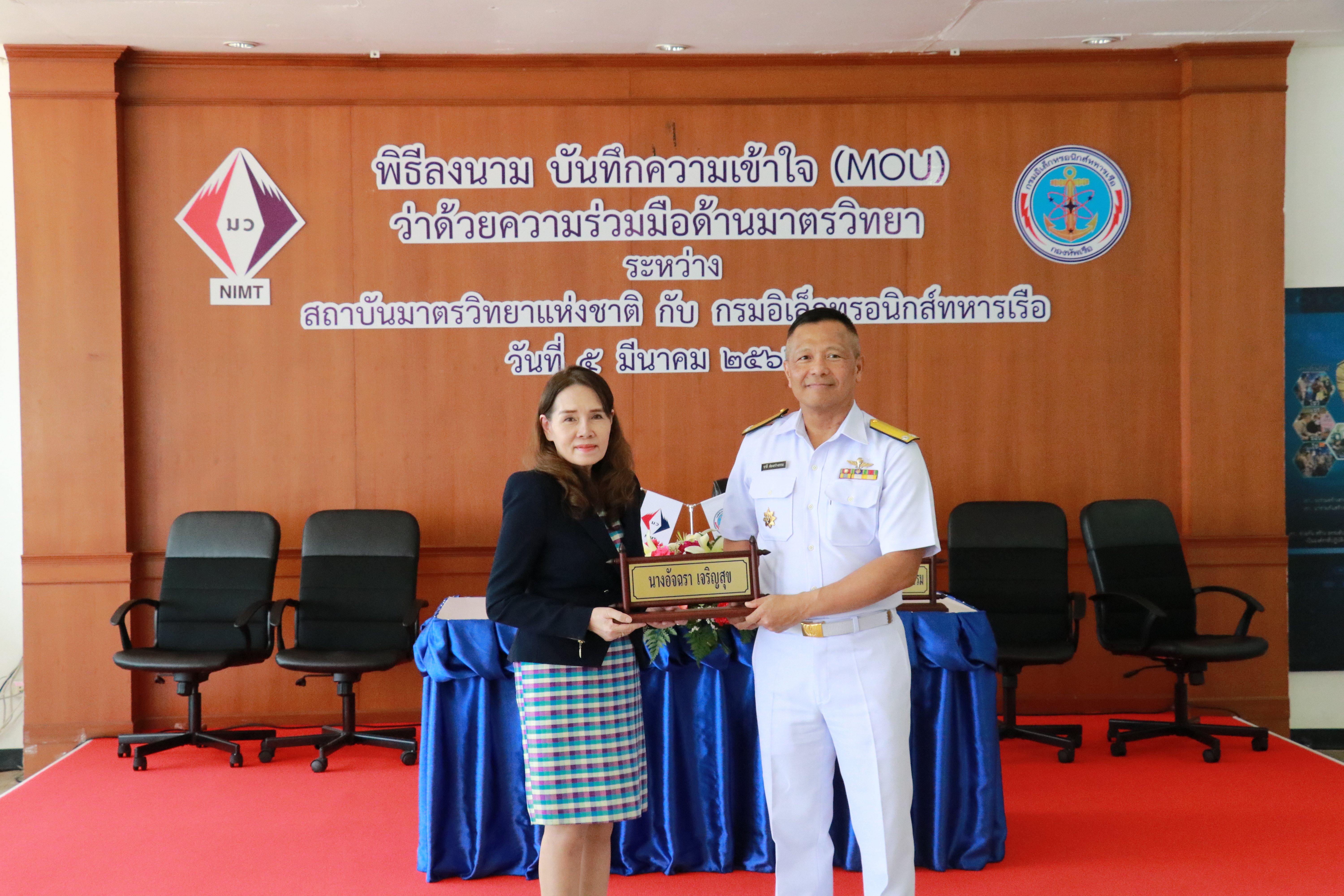 เมื่อวันอังคารที่ 5 มีนาคม 2562 นางอัจฉรา เจริญสุข ผู้อำนวยการสถาบันมาตรวิทยาแห่งชาติ (มว.) กระทรวงวิทยาศาสตร์และเทคโนโลยี และพลเรือตรี ชาลี ส่องสว่างธรรม เจ้ากรมอิเล็กทรอนิกส์ทหารเรือ กองทัพเรือ ร่วมลงนามบันทึกความเข้าใจว่าด้วยความร่วมมือด้านมาตรวิทยา ระหว่างสถาบันมาตรวิทยาแห่งชาติ กับกรมอิเล็กทรอนิกส์ทหารเรือ ณ กรมอิเล็กทรอนิกส์ทหารเรือ ฐานทัพเรือสัตหีบ จังหวัดชลบุรี ซึ่งการลงนามบันทึกความเข้าใจในครั้งนี้มีวัตถุประสงค์เพื่อร่วมกันพัฒนาองค์ความรู้ แลกเปลี่ยนความรู้และเทคโนโลยีด้านมาตรวิทยาในสาขาวิชาการอิเล็กทรอนิกส์ รวมถึงสนับสนุนห้องปฏิบัติการของกรมอิเล็กทรอนิกส์ทหารเรือ ให้เป็นที่ยอมรับในระดับสากล