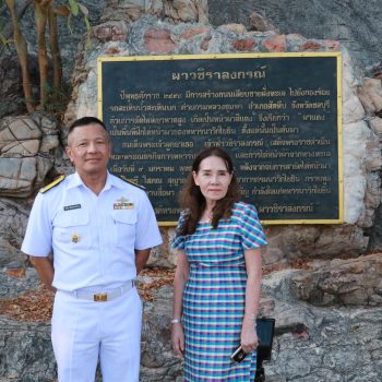 - ผมว. และ พลเรือตรี ชาลี ส่องสว่างธรรม เจ้ากรมอิเล็กทรอนิกส์ทหารเรือ ถ่ายภาพร่วมกันหน้าผาวชิราลงกรณ์