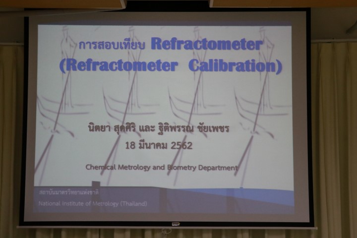 ส่วนฝึกอบรม กลุ่มงานพัฒนาธุรกิจ ฝ่ายนโยบายและยุทธศาสตร์ จัดอบรมประจำปี หัวข้อ “การสอบเทียงเครื่องวัดความหวาน” บรรยายให้ความรู้แก่ผู้เข้าฝึกอบรมที่สนใจจากหน่วยงานภาครัฐ เอกชน และอุตสาหกรรม โดย นางสาวนิตยา สุดศิริ นักมาตรวิทยาชำนาญการพิเศษ และนางสาวฐิติพรรณ ชัยเพชร นักมาตรวิทยาปฏิบัติการ ประจำห้องปฏิบัติการวิเคราะห์อินทรีย์เคมี กลุ่มงานวิเคราะห์อินทรีย์เคมี ฝ่ายมาตรวิทยาเคมีและชีวภาพ โดยมีวัตถุประสงค์เพื่อให้ผู้เข้ารับการอบรมได้เข้าใจหลักการสอบเทียบเครื่อง Refractometer และสามารถประเมินค่าความไม่แน่นอนในการสอบเทียบเครื่อง Refractometer ได้ ณ อาคารสำนักงานกลาง มว. จ.ปทุมธานี