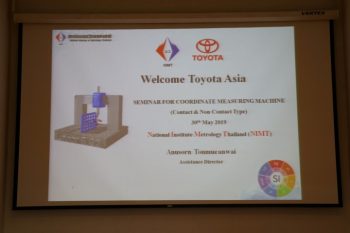นายอนุสรณ์ ทนหมื่นไวย ผู้ช่วยผู้อำนวยการ มว. ให้การต้อนรับผู้บริหารและคณะผู้ประสานด้านการบริหารจัดการการเครื่อมือวัดจากประเทศสมาชิก (ญี่ปุ่น ไทย อินโดนีเซีย เวียดนาม ฟิลิปปินส์ มาเลเซีย ไต้หวัน ปากีสถานและอินเดีย) ของบริษัท โตโยต้า ไดฮัทสุ เอ็นจิเนียริ่ง แอนด์ แมนูแฟคเจอริ่ง จำกัด ในโอกาสเข้าเยี่ยมชมและสัมมนาเกี่ยวกับการสอบเทียงเครื่องมือวัดสามแกน (Coordinate Measuring Machine) โดยมีวัตถุประสงค์เพื่อเพิ่มพูนความรู้การสอบเทียบตามข้อกำหนดมาตรฐาน ISO 10360-2, ISO 10360-5 และพัฒนาความร่วมมืองานด้านการบริหารการจัดการเครื่องมือวัดระหว่างประเทศ ณ อาคารผดุงมาตร มว. จ.ปทุมธานี
