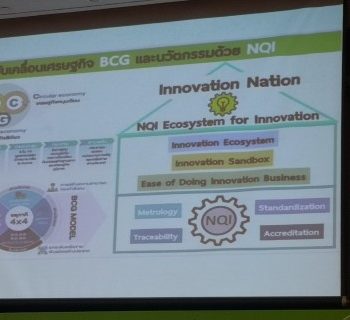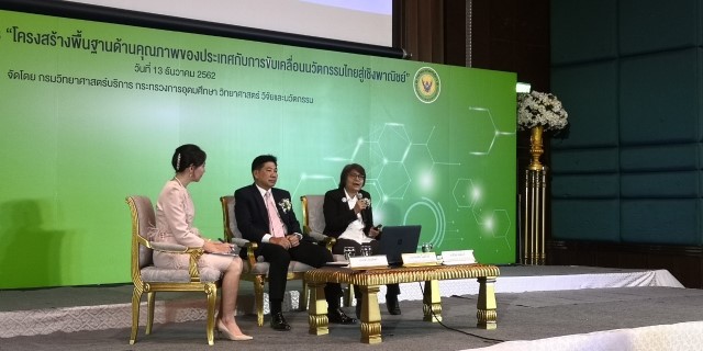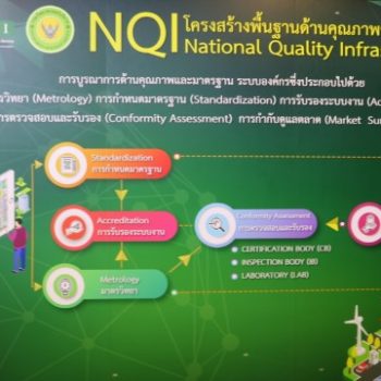 ในการนี้ ดร.สิวินีย์ สวัสดิ์อารี หัวหน้าฝ่ายมาตรวิทยาไฟฟ้า ผู้แทน สถาบันมาตรวิทยาแห่งชาติ (มว.) เข้าร่วมการเสวนา ให้ความรู้แก่ผู้เข้าร่วมงานใน หัวข้อ “โครงสร้างพื้นฐานด้านคุณภาพเพื่อรองรับการพัฒนานวัตกรรมของประเทศ” นอกจากนี้ สถาบันมาตรวิทยาแห่งชาติ หน่วยงานหลักที่รับผิดชอบดูแลเรื่องระบบมาตรวิทยาของประเทศ ได้ร่วมจัดนิทรรศการเผยแพร่ความรู้ เรื่อง มาตรวิทยา (metrology) ที่เป็นองค์ประกอบที่สำคัญในงานโครงสร้างพื้นฐานทางคุณภาพของประเทศ ที่เป็นกระบวนการทางวิทยาศาสตร์ที่ทำให้การวัด แม่นยำและเที่ยงตรง กระบวนการนี้เริ่มต้นจากการสถาปนามาตรฐานการวัดแห่งชาติ เพื่อเป็นต้นทางของความสามารถสอบกลับได้ทางมาตรวิทยา ของประเทศ และเชื่อมโยงมาตรฐานการวัดแห่งชาติกับนิยามของหน่วยเอสไอ เพื่อเชื่อมความสามารถสอบกลับได้ทางมาตรวิทยาภายในประเทศกับความสามารถสอบกลับได้ทางมาตรวิทยาระหว่างประเทศ ซึ่งงานด้านโครงสร้างพื้นฐานทางคุณภาพของประเทศ หรือที่เรียกย่อๆ ว่า NQI (National Quality Infrastructure) คือระบบงานที่ประกอบไปด้วย องค์กร (หลายองค์กรทั้งจากภาครัฐและเอกชน) โดยมีนโยบาย กฎหมายและกรอบการกำกับดูแล รวมถึงแนวปฏิบัติที่จำเป็นร่วมกันในการสนับสนุนและยกระดับคุณภาพ ความปลอดภัย และความเป็นมิตรต่อสิ่งแวดล้อมของสินค้า บริการ และกระบวนการ องค์กรในระบบ NQI ดำเนินงานร่วมกันภายใต้กระบวนการ 5 ด้าน ได้แก่ 1.มาตรวิทยา (metrology) 2.การกำหนดมาตรฐาน (Standardization) 3.การรับรองระบบงาน (Accreditation) 4.การตรวจสอบและรับรอง (Conformity Assessment 5. การกำกับดูแลตลาด (Market Surveillance) ซึ่ง NQI จำเป็นต่อการเสริมสร้างขีดความสามารถการแข่งขันของภาคการผลิตและบริการ โดยเฉพาะอย่างยิ่งในกระบวนการพัฒนาสู่ความมีคุณภาพ มาตรฐาน และความปลอดภัยของสินค้าและบริการ ดังนั้น หากประเทศไทยจัดการระบบ NQI ให้มีสมรรถนะ จะช่วยยกระดับ “สินค้าและบริการของไทย” ให้ขายได้ แข่งขันได้ ราคาดี และได้รับการยอมรับจากทุกภาคส่วนทั้งในและต่างประเทศ