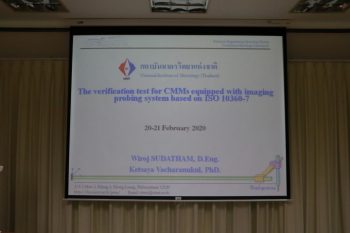 ส่วนฝึกอบรม กลุ่มงานพัฒนาธุรกิจ ฝ่ายนโยบายและยุทธศาสตร์ จัดอบรมประจำปีภายใต้หัวข้อ การทวนสอบซีเอ็มเอ็มแบบไม่สัมผัส หรือวิดีโอซีเอ็มเอ็มตามมาตรฐาน ISO 10360-7 บรรยายให้ความรู้แก่ผู้เข้าอบรมจากหน่วยงานทั้งจากภาครัฐ เอกชน และอุตสาหกรรม โดยดร.วิโรจน์ สุดาธรรม นักมาตรวิทยาชำนาญการ กลุ่มงานวิศวกรรมการวัดละเอียด และดร.เกษญา วัชระนุกุล หัวหน้ากลุ่มงานวิศวกรรมการวัดละเอียด ฝ่ายมาตรวิทยามิติ โดยมีวัตถุประสงค์เพื่อให้ผู้เข้าอบรมเข้าใจมาตรฐาน ISO 10360-7 หลักการทวนสอบ เข้าใจหลักการสอบเทียบ สามารถวิเคราะห์ข้อมูลผลการทดสอบได้ และสามารถประเมินความไม่แน่นอนตามมาตรฐานได้ ณ อาคารสำนักงานกลาง มว. จ.ปทุมธานี