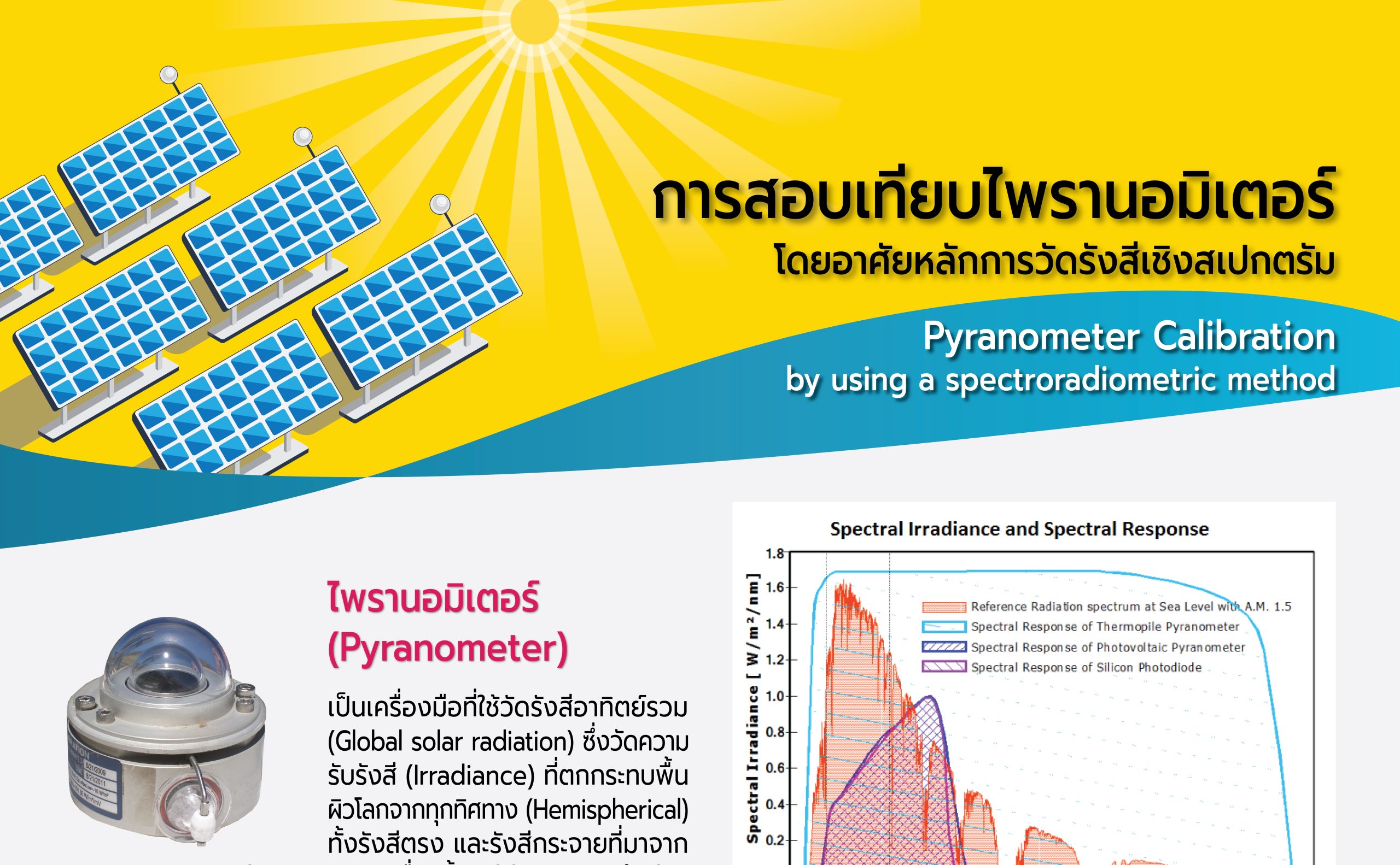 ไพรานอมิเตอร์ (Pyranometer) เป็นเครื่องมือที่ได้รับความนิยมในการใช้ตรวจติดตามค่าความรับรังสีอาทิตย์รวม (Global solar irradiance monitoring) ในระบบผลิตกระแสไฟฟ้าด้วยพลังงานแสงอาทิตย์ เพื่อประเมินศักยภาพพลังงานแสงอาทิตย์ หรือสมรรถนะของระบบ เครื่องมือนี้จำเป็นต้องได้รับการสอบเทียบอย่างสม่ำเสมอ เนื่องจากติดตั้งใช้งานกลางแจ้งเป็นเวลานาน อาจทำให้ผลการวัดผิดพลาดได้