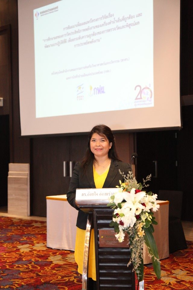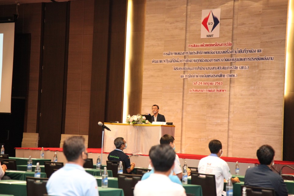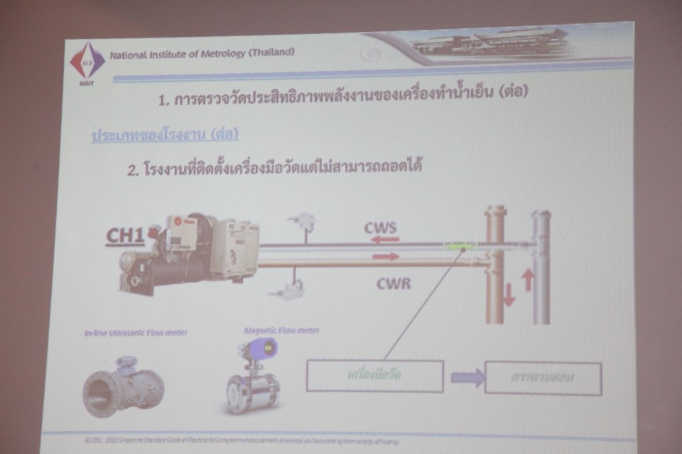 คณะนักวิจัยซึ่งประกอบไปด้วย 1.ดร.ธาดา แก้วประเสริฐ นักมาตรวิทยาฝ่ายมาตรวิทยาอุณหภูมิและแสง 2. ดร.ธัญญา คชวัฒน์ นักมาตรวิทยาฝ่ายมาตรวิทยาไฟฟ้า และ 3. ดร.ปฏิพัทธ์ วงค์เทพ นักมาตรวิทยาฝ่ายมาตรวิทยาเชิงกล จึงได้พัฒนาคู่มือแนวปฏิบัติที่ดีในการทวนสอบหรือสอบเทียบเครื่องวัดในระบบทำน้ำเย็นจำนวน 3 ฉบับ ซึ่งได้แก่ 1.คู่มือการสอบเทียบที่หน้างานของเครื่องวัดอุณหภูมิที่เครื่องทำน้ำเย็น 2. คู่มือการทวนสอบเครื่องมือวัดกำลังไฟฟ้าที่ติดตั้งหน้างาน 3.คู่มือการสอบเทียบและการทวนสอบเครื่องมือวัดอัตราการไหลน้ำเย็นที่เครื่องทำน้ำเย็น เพื่อเผยแพร่สู่สาธารณชนให้สามารถใช้เป็นแนวทางในการใช้งานได้จริง โดยโครงการนี้ได้รับการสนับสนุนทุนวิจัยและพัฒนา กฟผ.-สกว. ภายใต้ “โครงการการศึกษาผลของการวัดประสิทธิภาพพลังงานของเครื่องทำน้ำเย็นที่ถูกต้อง และพัฒนาแนวปฏิบัติที่ดีเพื่อยกระดับความถูกต้องของการตรวจวัดและพิสูจน์ผลการประหยัดพลังงาน”จากสำนักงานกองทุนสนับสนุนการวิจัย (สกว.) และการไฟฟ้าฝ่ายผลิตแห่งประเทศไทย (กฟผ.) ซึ่งภายในงานสัมมนาครั้งนี้ประกอบไปด้วยการบรรยายให้ความรู้ในหลากหลายหัวข้อ อาทิ “ความสำคัญและการตรวจวัดประสิทธิภาพของเครื่องทำน้ำเย็นอย่างถูกต้อง” “การพัฒนาแนวปฏิบัติที่ดีในการสอบเทียบเครื่องวัดในระบบทำน้ำเย็น” รวมไปถึง “การวิเคราะห์ทางการเงินของการตรวจวัดประสิทธิภาพที่มีความถูกต้อง” และการสรุปหาแนวทางการดำเนินงานเพื่อสนับสนุนการตรวจวัดและพิสูจน์ผลประหยัดพลังงาน ซึ่งความร่วมมือในการทำงานจากหลายภาคส่วนในครั้งนี้มีจุดมุ่งหมายร่วมกันคือต้องการให้ประเทศของเรามีการใช้พลังงานอย่างคุ้มค่าและเกิดประโยชน์สูงสุด เพื่อส่งต่อแนวคิด และวิธีการประหยัดพลังงานที่ดีจากรุ่นสู่รุ่น เพื่อให้คนไทยมีพลังงานใช้อย่างไม่สิ้นสุด