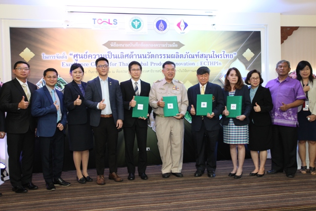 นางอัจฉรา เจริญสุข ผู้อำนวยการ มว. นายมรุต จิรเศรษฐสิริ อธิบดีกรมการแพทย์แผนไทยและแพทย์ทางเลือก ศาสตราจารย์ นายแพทย์บรรจง มไหสวริยะ อธิการบดีมหาวิทยาลัยมหิดล และ นายชัยรัตน์ แสงจันทร์ รองผู้อำนวยการด้านยุทธศาสตร์และบริหารองค์กร, รักษาการแทนผู้อำนวยการศูนย์ความเป็นเลิศด้านชีววิทยาศาสตร์ ร่วมลงนามในบันทึกข้อตกลงว่าด้วยความร่วมมือเพื่อพัฒนาผลิตภัณฑ์สุขภาพจากสมุนไพรไทยระหว่างกรมการแพทย์แผนไทยแห่งชาติ มหาวิทยาลัยมหิดล ศูนย์ความเป็นเลิศด้านชีววิทยาศาสตร์ และสถาบันมาตรวิทยาแห่งชาติ โดยมีผู้บริหาร และคณาจารย์ ของทั้งสี่หน่วยงานเข้าร่วมเป็นสักขีพยานในพิธีลงนามดังกล่าวด้วย ซึ่งการลงนามความร่วมมือครั้งนี้มีวัตถุประสงค์เพื่อให้เป็นศูนย์กลางในการพัฒนา แลกเปลี่ยนความรู้ และสร้างบุคลากร ตลอดจนการวิจัยและพัฒนาผลิตภัณฑ์สุขภาพจากสมุนไพรไทย อีกทั้งยังเป็นการยกระดับการตลาดด้วยผลิตภัณฑ์จากสมุนไพรที่มีนวัตกรรมด้วยระบบโครงสร้างพื้นฐานทางคุณภาพ ณ ห้องประชุมกรมหลวงวงศาธิราชสนิท ชั้น 5 ในโอกาสนี้ ผู้บริหารได้ร่วมพิธีเปิดป้ายและเยี่ยมชม “ศูนย์ความเป็นเลิศด้านนวัตกรรมผลิตภัณฑ์สมุนไพรไทย” ณ ห้องประชุมกรมหลวงวงศาธิราชสนิท ชั้น 3 และ 4 อาคารสถาบันวิจัยการแพทย์แผนไทย กรุงเทพมหานคร