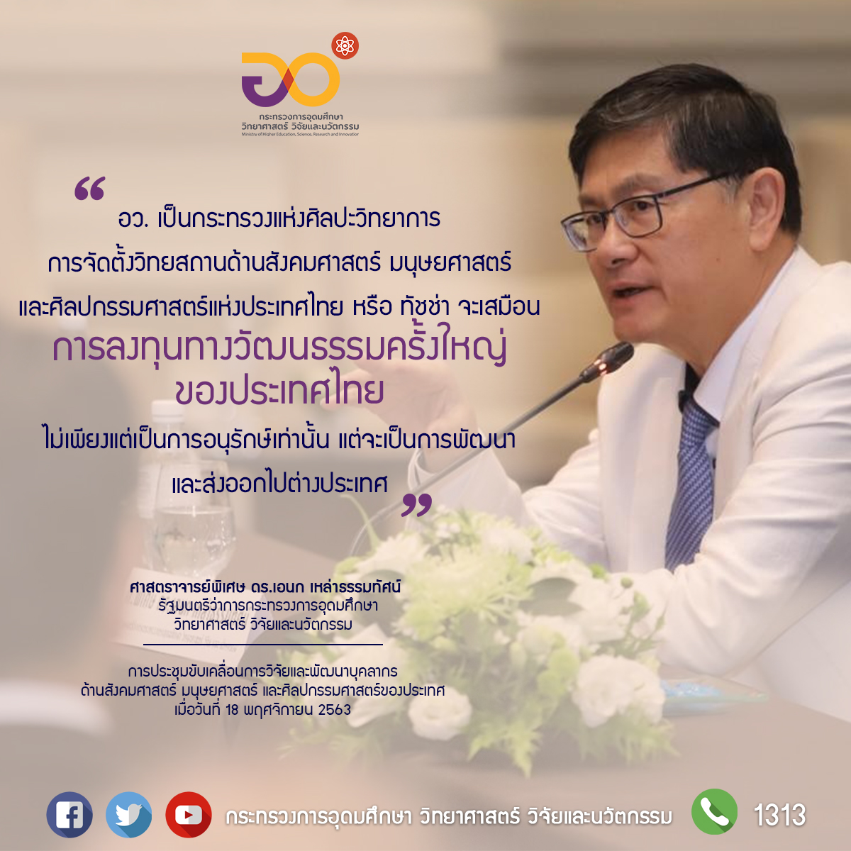 กล่าวไว้ในการประชุมขับเคลื่อนการวิจัยและพัฒนาบุคลากรด้านสังคมศาสตร์ มนุษยศาสตร์ และศิลปกรรมศาสตร์ของประเทศ