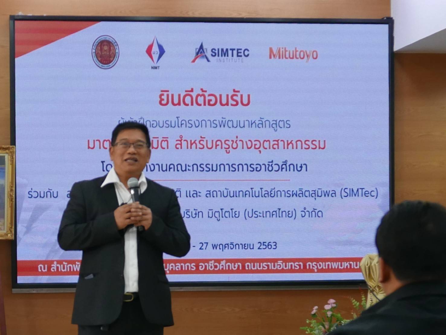สถาบันมาตรวิทยาแห่งชาติ ร่วมกับ สำนักงานคณะกรรมการการอาชีวศึกษา และสถาบันเทคโนโลยีการผลิตสุมิพล (SIMTec) โดยการสนับสนุนจากบริษัท มิตูโตโย (ประเทศไทย) จำกัด จัดอบรมเชิงปฏิบัติการ “โครงการพัฒนาทักษาด้านมาตรวิทยามิติ สำหรับครูช่างอุตสาหรรม” ภายใต้ข้อตกลงความร่วมมือระหว่างกัน โดยมีนายอนุสรณ์ ทนหมื่นไวย รองผู้อำนวยการ มว. เป็นประธานเปิดการอบรมดังกล่าว พร้อมด้วย ดร.จริยา บัวเจริญ หัวหน้าฝ่ายมาตรวิทยามิติ กรรมการโครงการ ดร.นรินทร์ จันทวงษ์ นักมาตรวิทยาชำนาญการ ดร.ธรรมรัตน์ สมทอง นักมาตรวิทยาชำนาญการ ดร.มูฮัมหมัด หมัดเด็น นักมาตรวิทยาชำนาญการ และ ดร.กิตติสัณห์ มงคลสุทธิรัตน์ นักมาตรวิทยาชำนาญการ เป็นวิทยากรบรรยายในหัวข้อ หลักการวัด GD&T ชนิดที่ต้องใช้ Datum ด้วยเครื่องมือวัดละเอียด ทั้งภาคทฤษฎีและภาคปฏิบัติ และหัวข้อ หลักการวัด GD&T ชนิดที่ไม่ต้องใช้ Datum ด้วยเครื่องมือวัดละเอียด ทั้งภาคทฤษฎีและภาคปฏิบัติ โดยมีวัตถุประสงค์เพื่อเสริมสร้างพัฒนาทักษะด้านมาตรวิทยามิติให้แก่ครูช่างอุตสาหกรรม ให้มีความรู้ความเข้าใจมากยิ่งขึ้น และนำความรู้ที่ได้จากการอบรมไปเผยแพร่ให้แก่นักเรียนนักศึกษา เพื่อเตรียมตัวเข้าสู่อาชีพต่อไปในอนาคต การอบรมดังกล่าวจัดขึ้น ณ สำนักงานพัฒนาสมรรถนะครูและและบุคลากรอาชีวศึกษา กรุงเทพมหานคร
