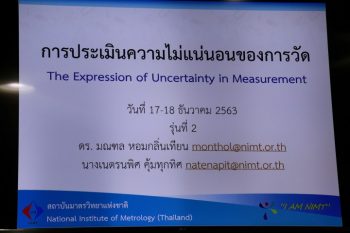 ส่วนฝึกอบรม กลุ่มงานพัฒนาธุรกิจ ฝ่ายนโยบายและยุทธศาสตร์ จัดอบรมหลักสูตรประจำปี หัวข้อ “การประเมินค่าความไม่แน่นอนของการวัด” รุ่น 2 บรรยายให้ความรู้แก่ผู้เข้ารับการฝึกอบรมที่สนใจจากหน่วยงานภาครัฐ เอกชน และอุตสาหกรรม โดย ดร.มณฑล หอมกลิ่นเทียน รักษาการหัวหน้ากลุ่มงานมาตรฐานปฐมภูมิไฟฟ้า เวลาและความถี่ และนางเนตรนพิศ คุ้มทุกทิศ รักษาการหัวหน้ากลุ่มงานไฟฟ้ากระแสตรงและความถี่ต่ำความถี่สูงและสนามแม่เหล็ก ฝ่ายมาตรวิทยาไฟฟ้า โดยมีวัตถุประสงค์เพื่อให้ผู้เข้าอบรมเข้าใจแนวทางการประเมินความไม่แน่นอนของการวัดตาม Guide to the expression of Uncertainty in Measurement (GUM) สามารถนำความรู้ไปประยุกต์ใช้ในการรายงานผลการทดสอบหรือผลการสอบเทียบของห้องปฏิบัติการ อีกทั้งเข้าใจการรายงานผลความไม่แน่นอนที่ระบุมากับใบรับรองการสอบเทียบและพร้อมนำไปใช้ได้อย่างถูกต้อง ณ อาคารมาตรธำรง มว. จ.ปทุมธานี