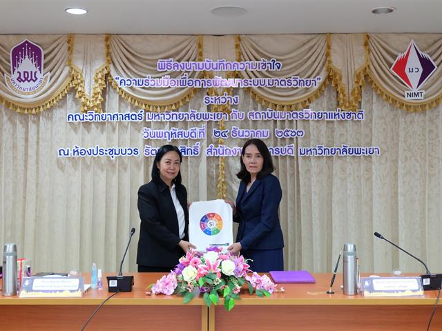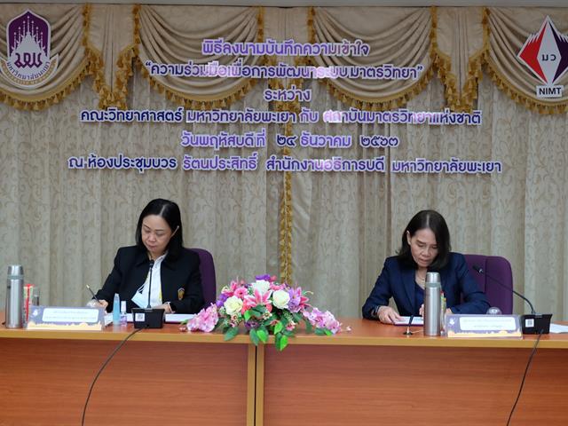 นางอัจฉรา เจริญสุข ผู้อำนวยการ มว. พร้อมด้วย นายอนุสรณ์ ทนหมื่นไวย รองผู้อำนวยการ พร้อมด้วยรองศาสตราจารย์ ดร.สุภกร พงศบางโพธิ์ อธิการบดีมหาวิทยาลัยพะเยา ร่วมลงนามบันทึกความเข้าใจว่าด้วย “ความร่วมมือเพื่อการพัฒนาระบบมาตรวิทยา” โดยมีวัตถุประสงค์เพื่อร่วมกันพัฒนาและจัดการหลักสูตรด้านมาตรวิทยาและโครงสร้างพื้นฐานทางคุณภาพให้แก่นิสิต บุคลากร บุคลากรภายนอกที่มีความสนใจ และยังรวมถึงการร่วมกันพัฒนางานวิจัยด้านมาตรวิทยาและถ่ายทอดเทคโนโลยีดังกล่าวให้กับภาคการศึกษาและอุตสาหกรรม รวมทั้งยังร่วมกันสนับสนุนการพัฒนาบุคลากรให้มีศักยภาพมากยิ่งขึ้น โดยมีคณะผู้บริหารคณะวิทยาศาสตร์ คณบดีคณะวิศวกรรมศาสตร์ คณบดีคณะวิทยาศาสตร์การแพทย์ คณบดีคณะเภสัชศาสตร์ คณบดีคณะสหเวชศาสตร์ ผู้อำนวยการสถาบันนวัตกรรมและถ่ายทอดเทคโนโลยี เข้าร่วมในการลงนามดังกล่าวด้วย ณ ห้องประชุมบวรรัตนประสิทธิ์ สำนักงานอธิการบดี มหาวิทยาลัยพะเยา