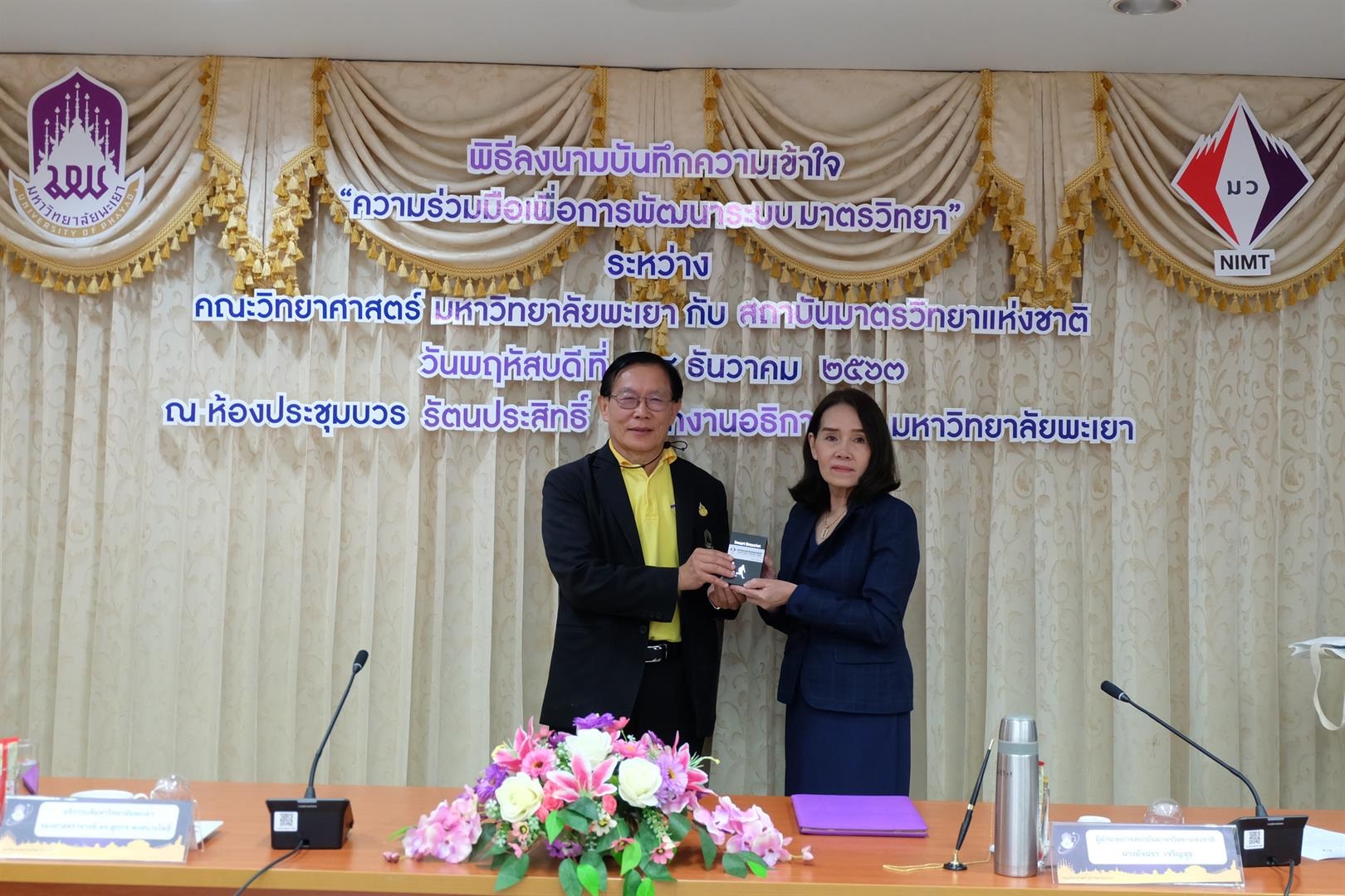 - นางอัจฉรา เจริญสุข ผู้อำนวยการ มว. มอบของที่ระลึกให้ รองศาสตราจารย์ ดร.สุภพร พงศบางโพธิ์ อธิการบดีมหาวิทยาลัยพะเยา