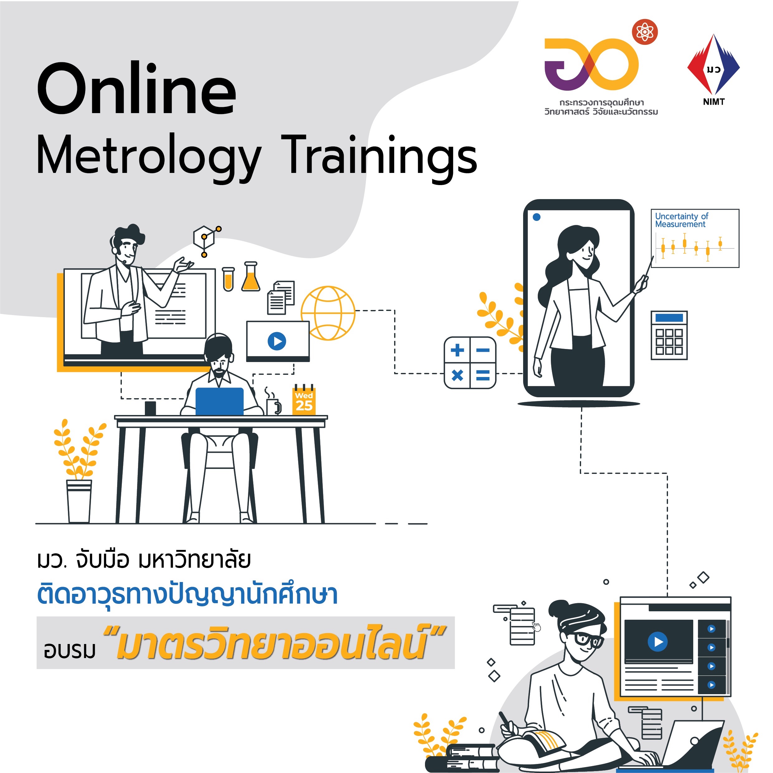 สถาบันมาตรวิทยาแห่งชาติร่วมมือกับมหาวิทยาลัย เสริมแกร่งทางปัญญาให้นักศึกษาและบุคลากรที่สนใจงานด้านมาตรวิทยา เร่งพัฒนาหลักสูตรมาตรวิทยาให้สอดรับกับความต้องการของตลาดแรงงานในปัจจุบัน ยืนยันไม่หยุดสร้างความรู้ รับมือสถานการณ์การแพร่ระบาดของโรคโควิด-19 จัดอบรมออนไลน์ต่อเนื่อง หวังให้นักศึกษามีความรู้หลากหลาย ต่อยอดเพิ่มเติมจากตำราเรียน…สู่การเป็นนักวิทยาศาสตร์แบบครบวงจร