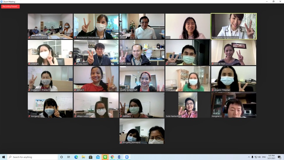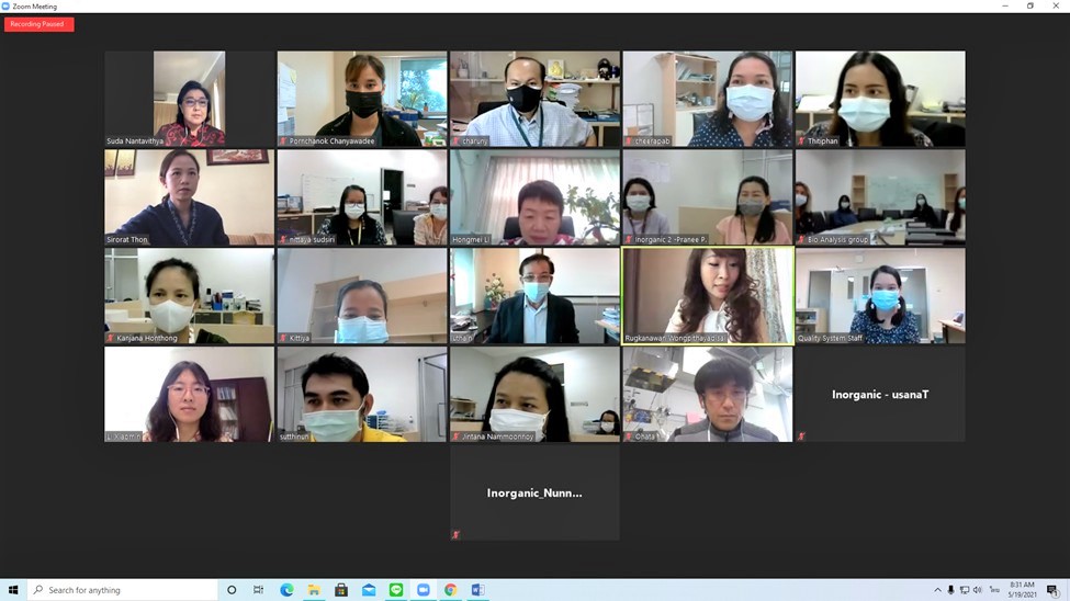 ร.ท.อุทัย นรนิ่ม ผู้ช่วยผู้อำนวยการ และผู้จัดการระบบคุณภาพ มว. ดร. จรัญ ยะฝา หัวหน้าฝ่ายมาตรวิทยาเคมีและชีวภาพ ดร. จีรพา บุญญคง กำกับดูแลกลุ่มงานวิเคราะห์อินทรีย์เคมี ดร.นงลักษณ์ ตั้งไพศาลกุล หัวหน้ากลุ่มงานวิเคราะห์อนินทรีย์เคมี พร้อมด้วยนักมาตรวิทยาในกลุ่มงานวิเคราะห์ชีวภาพ รวมทั้ง นางสาวรัคณาวรรณ วงศ์พิทยาดิศัย นักมาตรวิทยาชำนาญการพิเศษ ฝ่ายมาตรวิทยาเชิงกล และผู้ช่วยผู้จัดการคุณภาพ ISO/IEC 17025 ร่วมประชุมการตรวจประเมินระบบคุณภาพ ISO/IEC 17025 และ/หรือ ISO 17034 แบบระยะไกล (Remote assessment) ซึ่งเป็นการตรวจประเมินเพื่อรักษาสถานภาพ และขยายขีดความสามารถ โดยมีผู้ตรวจประเมินด้านระบบคุณภาพ (Quality Expert) จากสำนักงานมาตรฐานผลิตภัณฑ์อุตสาหกรรม (สมอ.) คือ คุณสุดา นันทวิทยา (อดีตผู้อำนวยการสำนักงานบริหารและรับรองห้องปฏิบัติการ กรมวิทยาศาสตร์บริการ) และผู้ตรวจประเมินด้านเทคนิคต่างประเทศ (ISO/IEC 17025) (Technical Expert) สำหรับกลุ่มงานวิเคราะห์อินทรีย์เคมี คือ Dr. Li Hongmei จาก National Institute of Metrology (NIM), China และ ผู้ตรวจประเมินด้านเทคนิคต่างประเทศ (ISO 17034) คือ Dr. Xiaomin Li จาก National Institute of Metrology (NIM), China ส่วนกลุ่มงานวิเคราะห์อนินทรีย์เคมี ผู้ตรวจประเมินด้านเทคนิคต่างประเทศ (ISO/IEC 17025 และ ISO 17034 คือ Dr. Masaki Ohata จาก National Metrology Institute of Japan (NMIJ), ประเทศญี่ปุ่น ซึ่งสำหรับกลุ่มงานวิเคราะห์อินทรีย์เคมี กิจกรรมนี้จะไปสนับสนุนอุตสาหกรรมอาหารฮาลาล สมุนไพร และการแพทย์ อ้อย น้ำตาลทรายและเครื่องดื่ม ซึ่ง มว. มีวิธีการวัดเพื่อให้ค่าอ้างอิง วัสดุอ้างอิงและโปรแกรมทดสอบความชำนาญ สำหรับห้องปฏิบัติการที่สนใจ และในส่วนของกลุ่มงานวิเคราะห์อนินทรีย์เคมี กิจกรรมนี้จะไปสนับสนุนอุตสาหกรรมอาหาร สิ่งแวดล้อม ยานยนต์ และการแพทย์ ตาม Thailand Reference Materials, TRM ที่มี