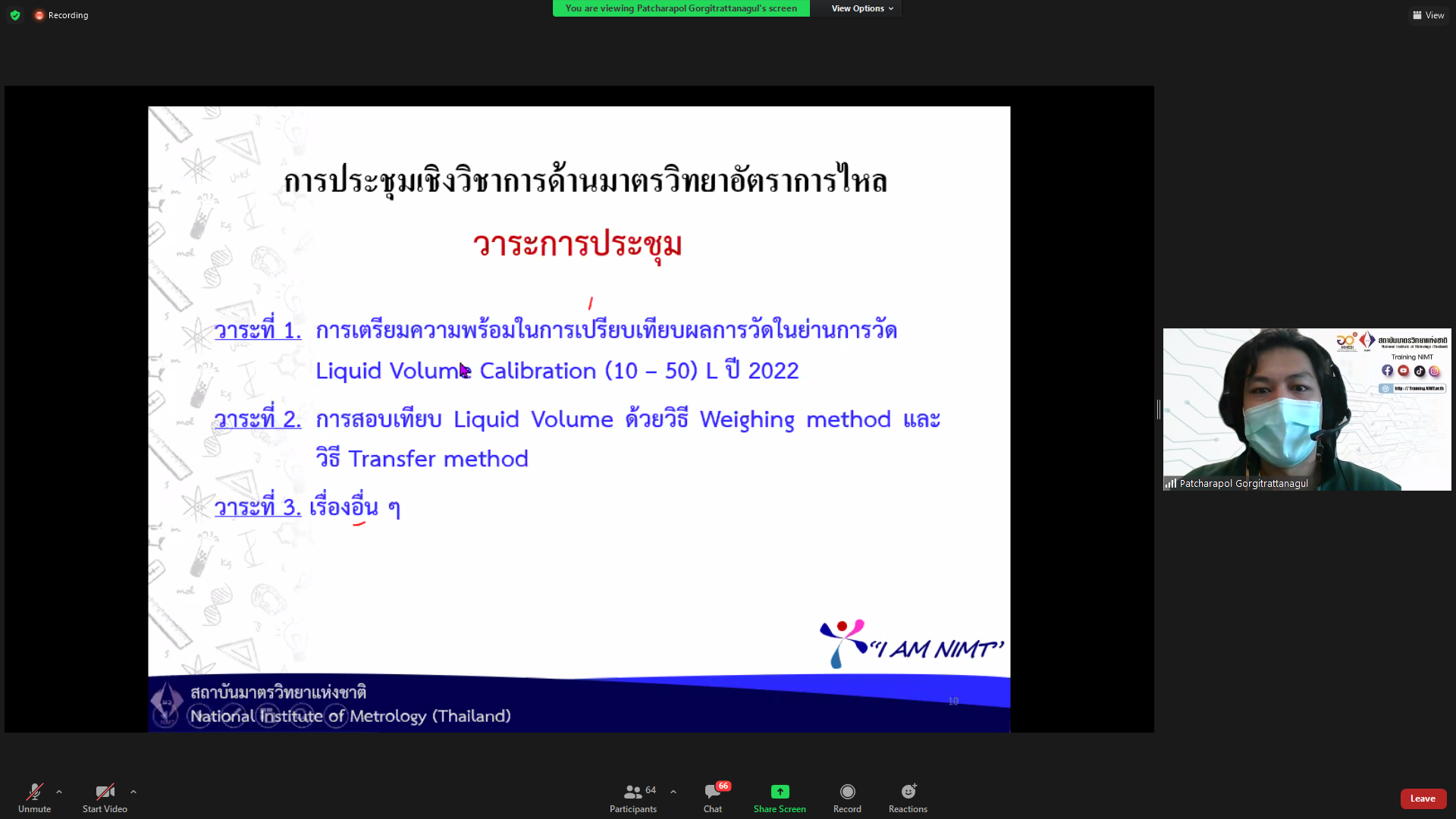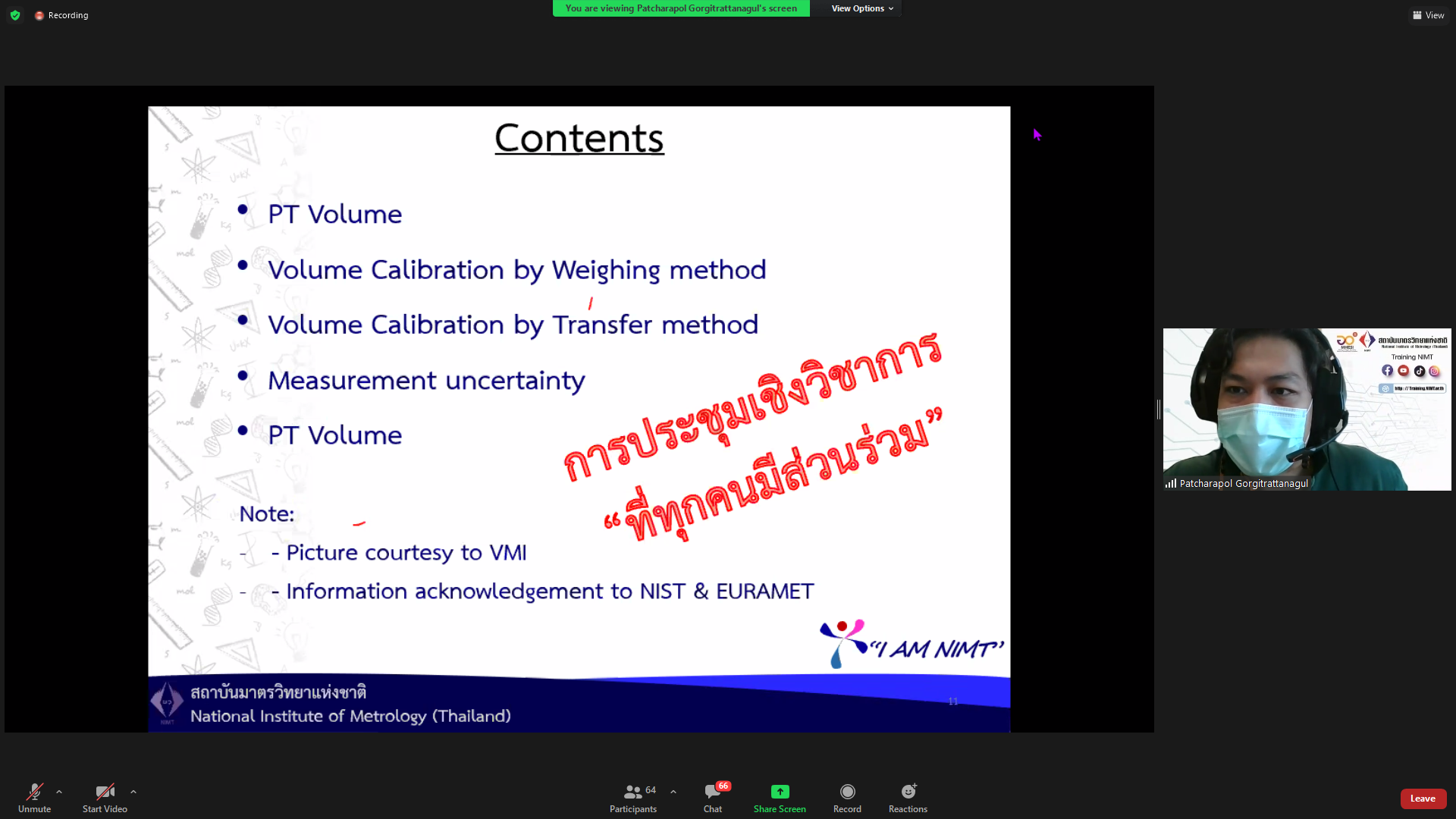 ชมรมมาตรวิทยาการไหล สถาบันมาตรวิทยาแห่งชาติ (มว.) จัดสัมมนาวิชาการ ครั้งที่ 2/2564 หัวข้อ “Liquid volume calibration” บรรยายให้ความรู้แก่สมาชิกชมรมที่สนใจจำนวนกว่า 70 ท่าน โดยเรื่องที่บรรยายมีการเปรียบเทียบผลการวัดทางด้านปริมาตร การสอบเทียบปริมาตรโดยวิธีการชั่งน้ำหนัก การสอบเทียบปริมาตรด้วยการตวงแล้วเท และยังรวมถึงเรื่องความไม่แน่นอนของการวัดอีกด้วย โดยวิทยากร ดร.พัชรพล กอกิตรัตนกุล นักมาตรวิทยาปฏิบัติการ กลุ่มงานกลศาสตร์ของไหล ฝ่ายมาตรวิทยาเชิงกล ได้มาแบ่งปันความรู้ และตอบข้อสงสัยของสมาชิกชมรม การสัมมนาวิชาการดังกล่าว จัดขึ้นในแบบออนไลน์ ณ สถาบันมาตรวิทยาแห่งชาติ (มว.) จ.ปทุมธานี