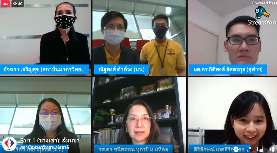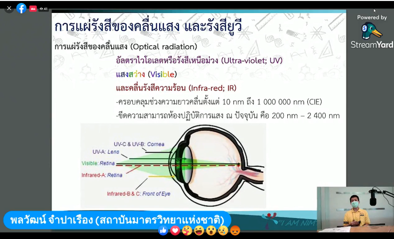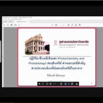 นางอัจฉรา เจริญสุข ผู้อำนวยการ มว. เป็นประธานเปิดงานสัมมนาผ่านระบบการถ่ายทอดสดหัวข้อ “เทคโนโลยีอาหารแห่งอนาคต: การเพิ่มศักยภาพอุตสาหกรรมอาหาร เครื่องดื่ม น้ำดื่มและยาด้วยเทคโนโลยีแสง” ซึ่งจัดขึ้นโดยฝ่ายมาตรวิทยาอุณหภูมิและแสง เรื่องที่บรรยายในช่วงเช้า ได้แก่ ข้อกำหนดและระเบียบวิธีการขึ้นทะเบียนตามประกาศกรทรวงสาธารณสุข (ฉบับที่ 376) พ.ศ. 2559 เรื่องอาหารใหม่ (Novel Foods) บรรยายให้ความรู้โดย นางสาวศิริลักษณ์ เกศสิริกุล นักวิชาการอาหารและยาปฏิบัติการ กลุ่มงานกำหนดมาตรฐาน กองอาหาร สำนักงานคณะกรรมการอาหารและยา (อย.) ต่อด้วยเรื่อง ข้อกำหนด มาตรฐาน และการตรวจวัด สำหรับเทคโนโลยีรังสียูวีในกระบวนการผลิตอาหารรูปแบบใหม่ โดย นายพลวัฒน์ จำปาเรือง นักมาตรวิทยาปฏิบัติการ กลุ่มงานแสงและสี ฝ่ายมาตรวิทยาอุณหภูมิและแสง สถาบันมาตรวิทยาแห่งชาติ (มว.) ในช่วงบ่ายก็ได้มีการบรรยายในเรื่อง ปฏิกิริยาชีวเคมีเชิงแสง (Photochemistry and Photobiology) ต่อจุลินทรีย์ สารออกฤทธิ์สำคัญ สารประกอบอินทรีย์และอนินทรีย์ในอาหาร โดย ผศ.ดร. กิติพงศ์ อัศตรกุล อาจารย์สาขาจุลชีววิทยาทางอาหาร ภาควิชาเทคโนโลยีทางอาหาร คณะวิทยาศาสตร์ จุฬาลงกรณ์มหาวิทยาลัย ต่อด้วยหัวข้อ การประเมินผลทางวิทยาศาสตร์ของอาหารแนวใหม่ (Novel Foods) โดย รศ.ดร. ชนิพรรณ บุตรยี่ จากสถาบันโภชนาการแห่งมหาวิทยาลัยมหิดล