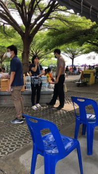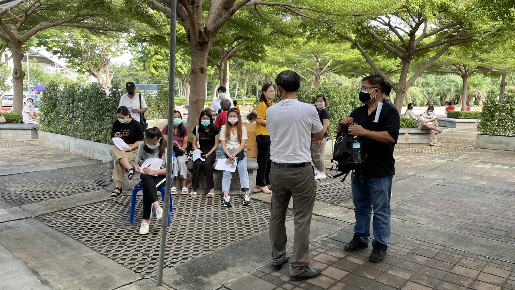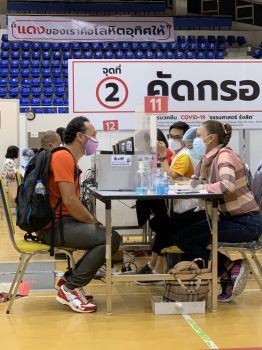 - พนักงาน มว. ระหว่างรอรับการซักประวัติ ก่อนได้รับการฉีดวัคซีน
