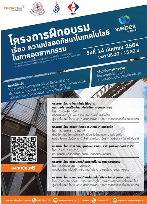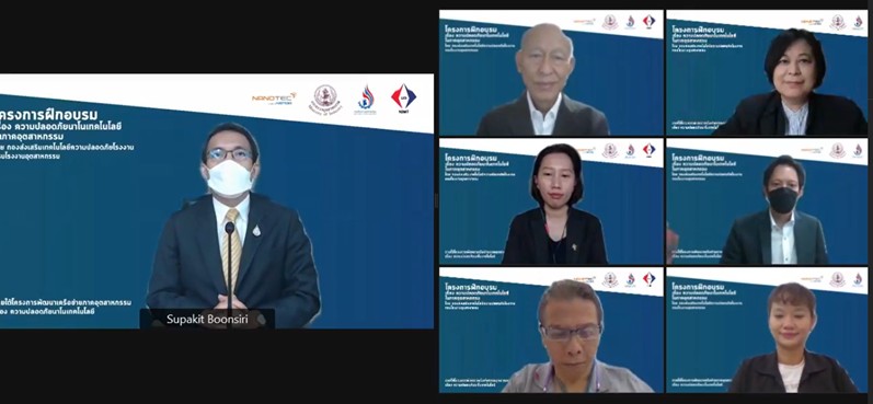 โดยการจัดฝึกอบรม เรื่อง ความปลอดภัยนาโนเทคโนโลยีในภาคอุตสาหกรรม ครั้งนี้ เป็นความร่วมมือภายใต้โครงการพัฒนาเครือข่ายภาคอุตสาหกรรม เรื่องความปลอดภัยนาโนเทคโนโลยี ที่จัดโดย กองส่งเสริมเทคโนโลยีความปลอดภัยในโรงงาน กรมโรงงานอุตสาหกรรม (กรอ.) ร่วมกับศูนย์นาโนเทคโนโลยีแห่งชาติ และสถาบันมาตรวิทยาแห่งชาติ ซึ่งเป็นการบรรยายให้ความรู้ผ่านสื่อออนไลน์ โดยมีวัตถุประสงค์เพื่อส่งเสริมความรู้เกี่ยวกับนาโนเทคโนโลยี การประยุกต์ใช้นาโนเทคโนโลยีในภาคอุตสาหกรรม และมาตรการความปลอดภัยสำหรับการผลิตและการใช้วัสดุนาโน ให้กับผู้ประกอบกิจการโรงงานและหน่วยงานที่เกี่ยวข้อง ในการนี้ พลตรี รองศาสตราจารย์ ดร.ชัยณรงค์ เชิดชู ประธานคณะกรรมการคณะทำงานโครงการพัฒนาเครือข่ายภาคอุตสาหกรรม เรื่องความปลอภัยนาโนเทคโนโลยี ให้เกียรติเป็นประธานกล่าวต้อนรับผู้เข้าอบรม และต่อด้วยการกล่าวเปิดการฝึกอบรม โดย นายศุภกิจ บุญศิริ รองอธิบดีกรมโรงงานอุตสาหกรรม โดยภายในงานยังได้รับเกียรติจากวิทยากรและผู้ทรงคุณวุฒิในภาคอุตสาหกรรม และความปลอดภัยนาโนเทคโนโลยีสำหรับภาคอุตสาหกรรม โดย ดร.เวฬุรีย์ ทองคา ศูนย์นาโนเทคโนโลยีแห่งชาติ สวทช., ความสำคัญของขนาดและการตรวจวัด โดย นักวิจัย ศูนย์นาโนเทคโนโลยีแห่งชาติ สวทช., ความปลอดภัยสารเคมีในโรงงานอุตสาหกรรม โดย ดร.ปัมวรรณ คุณประเสริฐ กองส่งเสริมเทคโนโลยีความปลอดภัยโรงงาน กรมโรงงานอุตสาหกรรม เป็นต้น และการจัดอบรมในครั้งนี้ได้รับการตอบรับที่ดี โดยมีผู้สนใจเข้าร่วมฟังเป็นจำนวนมาก อันจะเป็นการส่งเสริมการสร้างความตระหนักถึงความปลอดภัย และมาตรฐานด้านนาโนเทคโนโลยีภายในประเทศได้ต่อไป
