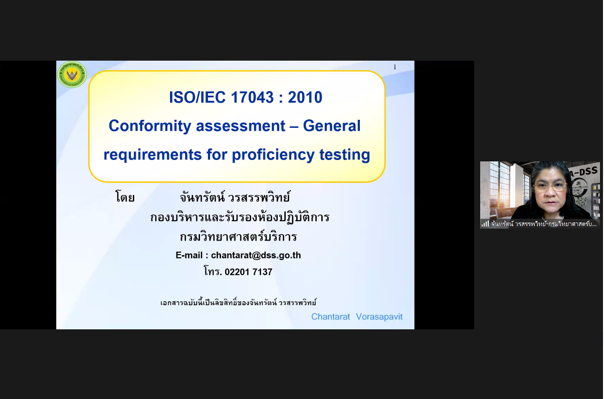 กลุ่มงานวิเคราะห์อนินทรีย์เคมี ฝ่ายมาตรวิทยาเคมีและชีวภาพ สถาบันมาตรวิทยาแห่งชาติจัดอบรมออนไลน์ หลักสูตร: ISO/IEC 17043:2010 และการจัดทำเอกสาร ให้แก่ผู้จัดโปรแกรมทดสอบความชำนาญรายใหม่ (New Proficiency Testing Provider, new PTP) ได้รับเกียรติจากดร.พจมาน ท่าจีน ผู้อำนวยการกองบริหารและรับรองห้องปฏิบัติการ และคุณจันทรัตน์ วรสรรพวิทย์ หัวหน้ากลุ่มรับรองงานห้องปฏิบัติการ กองบริหารและรับรองห้องปฏิบัติการ กรมวิทยาศาสตร์บริการ มาเป็นวิทยากรบรรยาย โดยวัตถุประสงค์ของหลักสูตรนี้เพื่อให้ PTP มีความรู้ความเข้าใจในข้อกำหนดของ ISO/IEC 17043:2010 สามารเตรียมความพร้อมในการจัดทำเอกสารเพื่อขอการรับรอง ในการพัฒนาเป็นผู้จัดโปรแกรมทดสอบความชำนาญตามมาตรฐานสากลได้ การอบรมในครั้งนี้จัดขึ้นแบบออนไลน์ผ่าน Application Zoom ณ สถาบันมาตรวิทยาแห่งชาติ (มว.) จ.ปทุมธานี