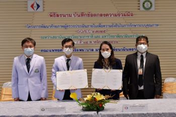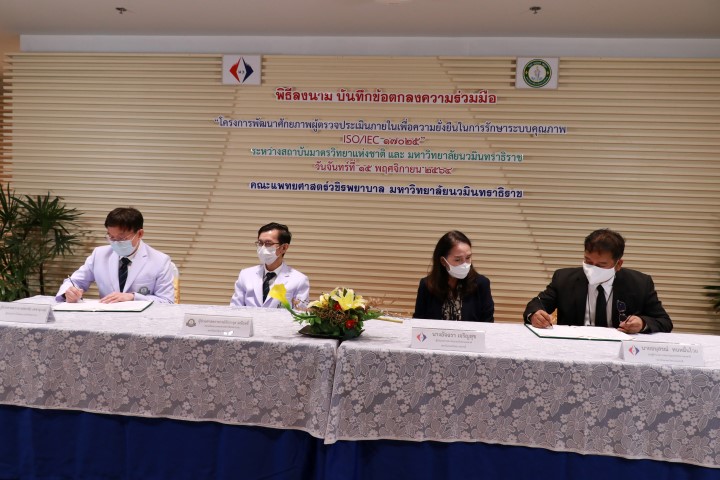 นางอัจฉรา เจริญสุข ผู้อำนวยการสถาบันมาตรวิทยาแห่งชาติ (มว.) และผู้ช่วยศาสตราจารย์จักราวุธ มณีฤทธิ์ คณบดีคณะแพทย์ศาสตร์วชิรพยาบาล ปฏิบัติการแทนอธิการบดีมหาวิทยาลัยนวมินทราธิราช ร่วมลงนามในบันทึกข้อตกลง (Memorandum of Agreement : MoA) ภายใต้ “โครงการพัฒนาศักยภาพผู้ตรวจประเมินภายในเพื่อความยั่งยืนในการรักษาระบบคุณภาพ ISO/IEC 17025 แก่โรงพยาบาลวชิรพยาบาล คณะแพทย์ศาสตร์วชิรพยาบาล มหาวิทยาลัยนวมินทราธิราช” โดยมีคณะผูบริหารและพนักงานของทั้งสองหน่วยงานร่วมเป็นสักขีพยานในพิธีลงนามดังกล่าว การลงนามความร่วมมือในครั้งนี้มีวัตถุประสงค์เพื่อให้การรับรองความสามารถทางวิชาการด้านมาตรวิทยาทางการแพทย์ และพัฒนาศักยภาพผู้ตรวจประเมินภายใน ในการรักษาระบบคุณภาพ ISO/IEC 17025 ให้แก่โรงพยาบาลวิชรพยาบาล คณะแพทย์ศาสตร์วชิรพยาบาล มหาวิทยาลัยนวมินทราธิราช ซึ่งเป็นกลไกสำคัญในการสร้างความเชื่อถือว่าห้องปฏิบัติการของหน่วยงานได้รับการรับรองจากหน่วยรับรองที่เป็นที่ยอมรับในระดับชาติและนานาชาติ มีขีดความสามารถในการให้บริการแก่ประชาชนที่มาใช้บริการได้อย่างถูกต้องแม่นยำ การลงนามดังกล่าวจัดขึ้น ณ ตึกพัชรกิติยาภา คณะแพทยศาสตร์วชิรพยาบาล มหาวิทยาลัยนวมินทราธิราช กรุงเทพฯ