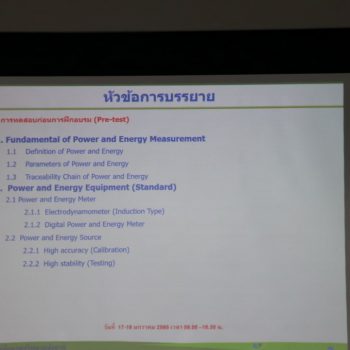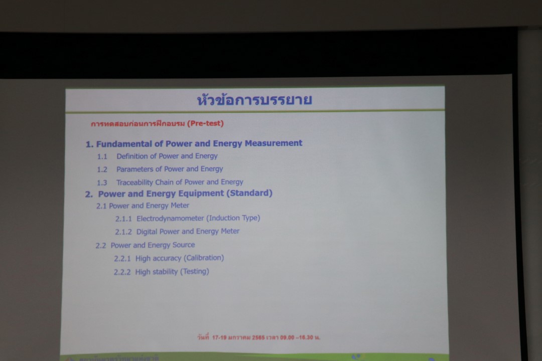 ส่วนฝึกอบรม กลุ่มงานพัฒนาธุรกิจ ฝ่ายนโยบายและยุทธศาสตร์ จัดการอบรมหลักสูตรมาตรวิทยาประจำปี 2565 ในหัวข้อ “ การสอบเทียบเครื่องมือวัดพลังงานไฟฟ้า” เพื่อให้ความรู้แก่ผู้เข้าอบรมที่สนใจต้องการนำความรู้ที่ได้ไปใช้ในการสอบเทียบเครื่องวัดพลังงานไฟฟ้า (Energy Meter) โดยใช้แหล่งจ่ายกำลังไฟฟ้า และพลังงานไฟฟ้ามาตรฐาน เช่น Electrical Power Standard ทั้งจากภาครัฐ เอกชน และอุตสาหกรรม บรรยายโดย พ.อ.อ.วรพล พระภักดี นักมาตรวิทยาชำนาญการพิเศษ กลุ่มงานไฟฟ้ากำลังและเครื่องมือวัดไฟฟ้าความถูกต้องสูง ฝ่ายมาตรวิทยาไฟฟ้า ทั้งนี้เพื่อให้ผู้เข้าอบรมมีความรู้ความสามารถในการสอบเทียบเครื่องวัดพลังงานไฟฟ้าทั้งในรูปแบบ มี และไม่มี pulse output ได้ และสามารถประเมินความไม่แน่นอนของการวัดพลังงานไฟฟ้าได้ โดยผู้เข้ารับการอบรมจะได้เรียนรู้เนื้อหาทั้งในภาคทฤษฎี และภาคปฏิบัติ เพื่อให้ผู้เข้าอบรมสามารถนำความรู้ที่ได้รับจากการอบรมไปประยุกต์ใช้ในการปฏิบัติงานได้จริง ณ ห้องประชุมชั้น 3 อาคารพัฒนามาตรฐานการวัดเพื่อรองรับการพัฒนาระบบราง (มว.) จ.ปทุมธานี