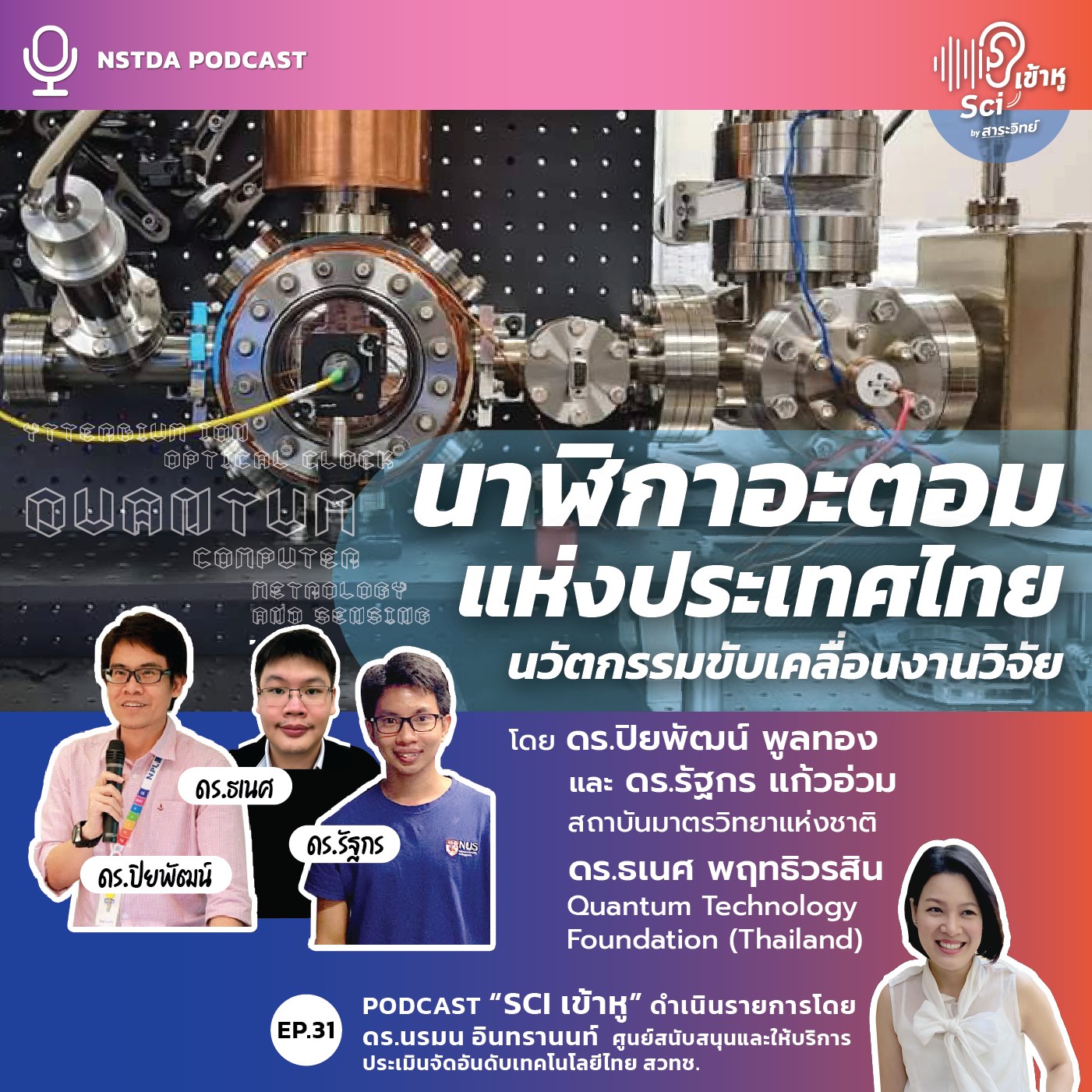 ในโอกาสนี้ ดร. ปิยพัฒน์ พูลทอง นักมาตรวิทยาชำนาญการ และดร.รัฐกร แก้วอ่วม นักวิจัยหลังปริญญาเอก ห้องปฏิบัติการเวลาและความถี่ ฝ่ายมาตรวิทยาไฟฟ้า ได้รับเกียรติในฐานะนักวิจัย พร้อมทั้ง ดร.ธเนศ พฤทธิวรสิน Quantum Technology Foundation (Thailand) ถูกเชิญให้มาร่วมพูดคุยถึง โครงการนาฬิกาอะตอมเชิงแสงของไอออนธาตุอิธเธอเบียม (Ytterbium ion optical clock) ที่จะมาช่วยเพิ่มประสิทธิภาพของโครงสร้างพื้นฐานทางด้านเวลาและความถี่ของประเทศไทย ซึ่งยังส่งผลกระทบต่อการวัดทางมิติและการวัดทางไฟฟ้าให้มีความแม่นยำมากขึ้น อีกทั้งยังเป็นเครื่องมือพื้นฐานในการทำวิจัยด้านเทคโนโลยีควอนตัม ไม่ว่าจะเป็นมาตรวิทยาและการตรวจวัดเชิงควอนตัม (Quantum Metrology and Sensing) หรือควอนตัมคอมพิวเตอร์ (Quantum Computer) ในรายการ Podcast รายการ Sci เข้าหู EP31 จากนิตยสารสาระวิทย์ สวทช. โดยมีผู้ดำเนินรายการ ดร.นรมน อินทรานนท์ ศูนย์สนับสนุนและให้บริการประเมินจัดอันดับเทคโนโลยีไทย สวทช.