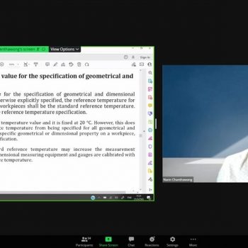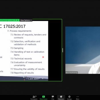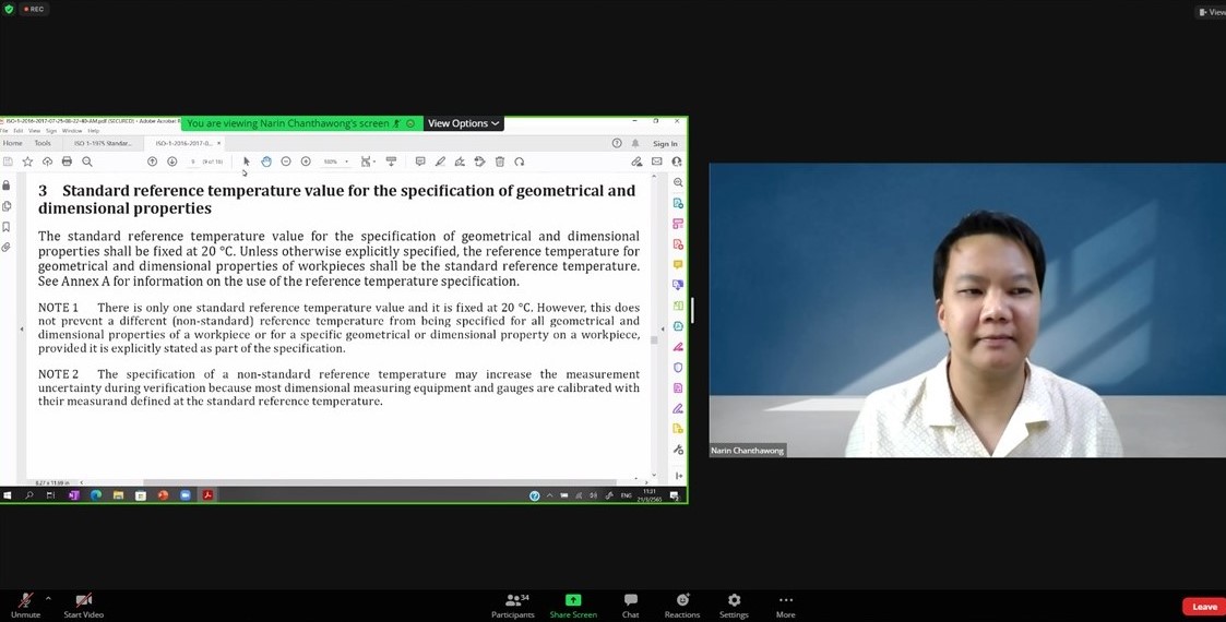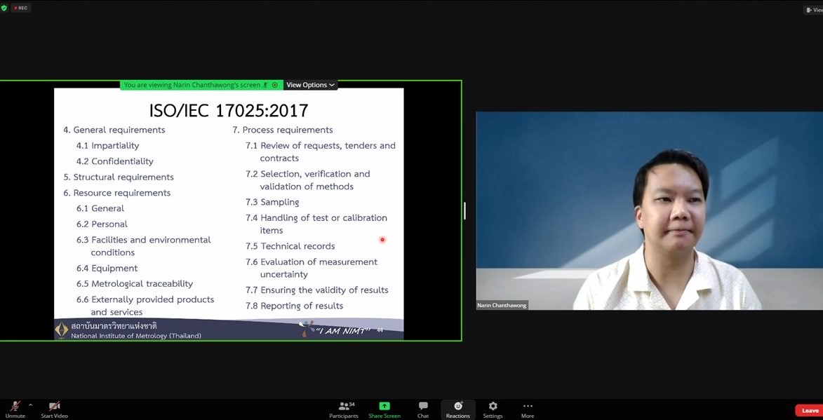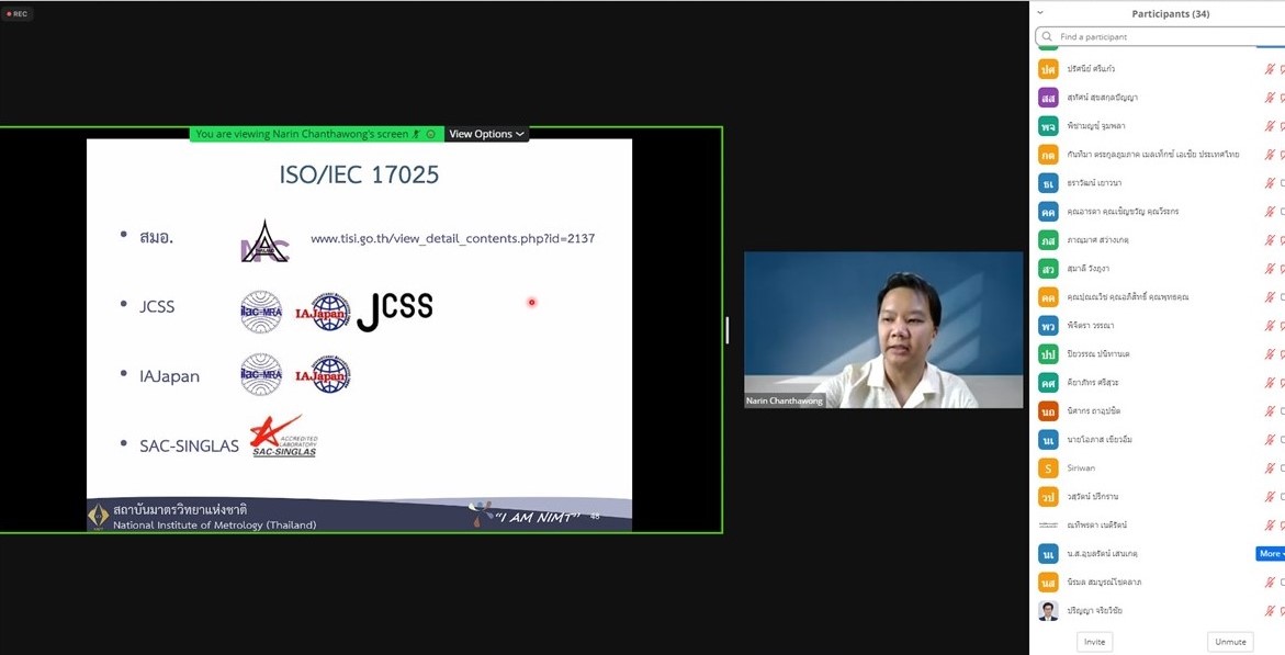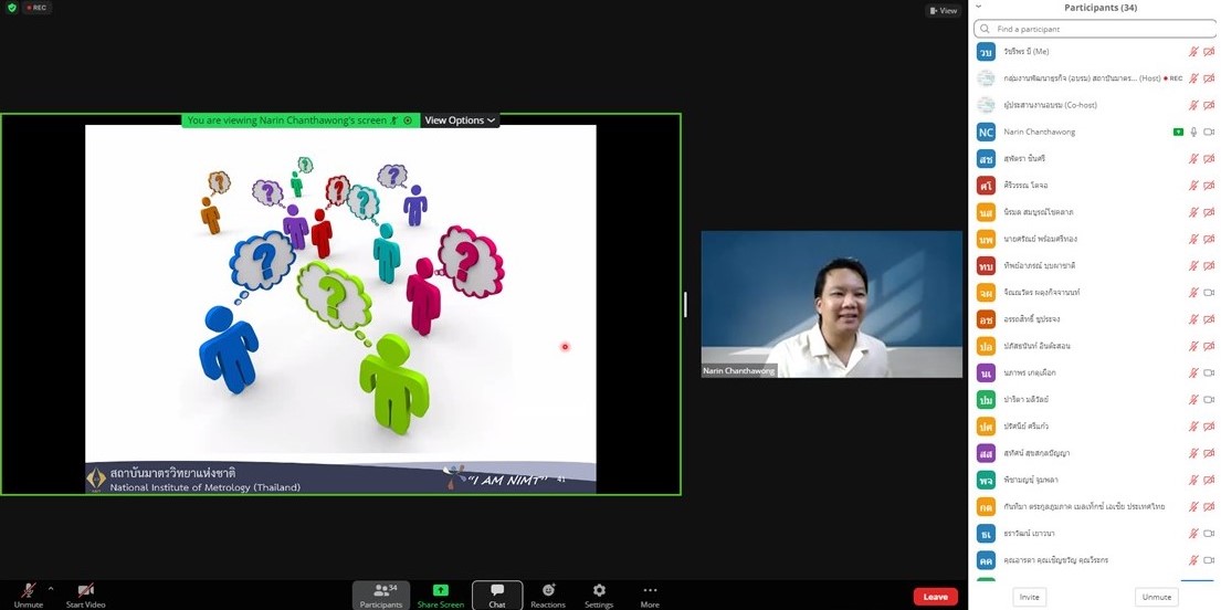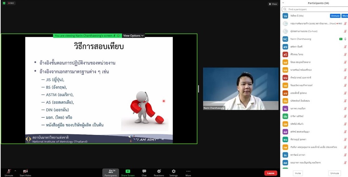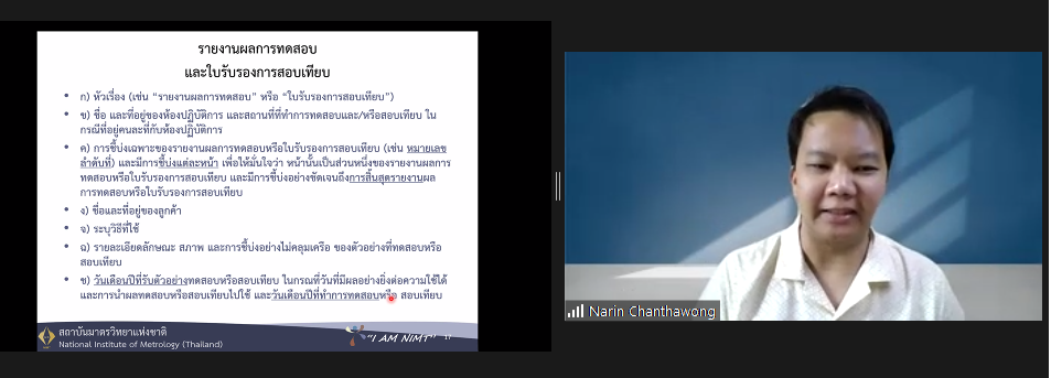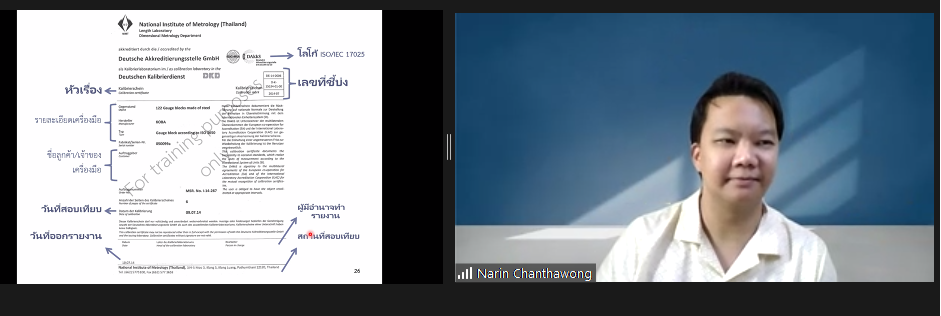 ส่วนฝึกอบรม กลุ่มงานพัฒนาธุรกิจ ฝ่ายนโยบายและยุทธศาสตร์ จัดการอบรมหลักสูตรมาตรวิทยาประจำปี 2565 ในรูปแบบออนไลน์ หัวข้อ “ การแปลความและประยุกต์ใช้ใบรายงานผลการสอบเทียบเพื่อควบคุมคุณภาพ ” เพื่อให้ผู้เข้าอบรมทั้งจากภาครัฐ เอกชน และอุตสาหกรรมมีความรู้ความเข้าใจรายละเอียดต่างๆ ในใบรายงานผลการสอบเทียบ และสามารถใช้ใบรายงานผลการสอบเทียบในการควบคุมคุณภาพ พร้อมทั้งมีทักษะในการประยุกต์ใช้ใบรายงานการสอบเทียบ บรรยายโดย ดร.นรินทร์ จันทวงศ์ นักมาตรวิทยาชำนาญการ กลุ่มงานมาตรวิทยานาโน ฝ่ายมาตรวิทยามิติ โดยผู้เข้ารับการอบรมจะได้เรียนรู้เนื้อหาเกี่ยวกับนิยามศัพท์ที่เกี่ยวข้อง หลักสถิติเบื้องต้น การกำหนดขอบเขตค่าความคลาดเคลื่อนที่ยอมรับได้ รายละเอียดในใบรับรองสอบเทียบ และการประยุกต์ใช้ค่าจากใบรับรองการสอบเทียบ เพื่อควบคุมคุณภาพ ตลอดจนการตอบข้อซักถามกับวิทยากร เพื่อให้ผู้เข้าอบรมสามารถนำความรู้ที่ได้รับไปประยุกต์ใช้ในการปฏิบัติงานได้จริง ณ ห้องประชุมชั้น 3 อาคารพัฒนามาตรฐานการวัดเพื่อรองรับการพัฒนาระบบราง (มว.) จ.ปทุมธานี