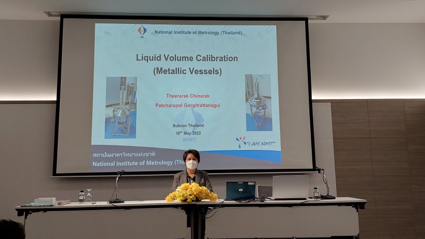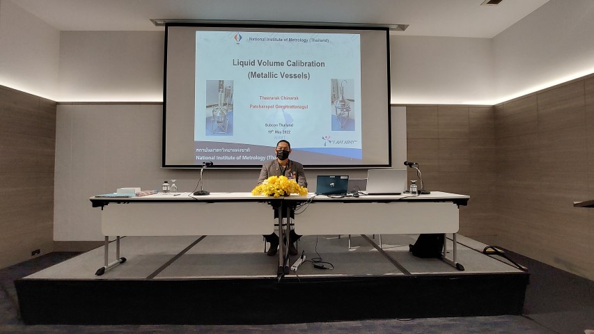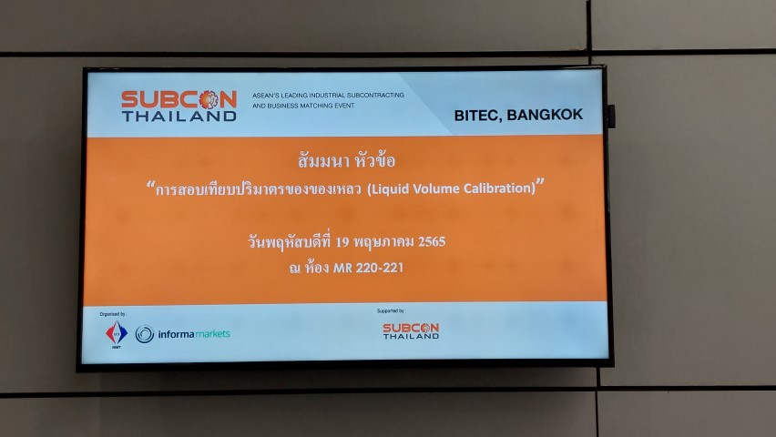 สถาบันมาตรวิทยาแห่งชาติ (มว.) ร่วมกับ อินฟอร์มา มาร์เก็ตส์ จัดสัมมนาวิชาการภายใต้หัวข้อ “การสอบเทียบปริมาตรของของเหลว” บรรยายให้ความรู้แก่ผู้สนใจโดย ดร.ธีรารักษ์ ชินารักษ์ และ ดร.พัชรพล กอกิตรัตนกุล นักมาตรวิทยา กลุ่มงานกลศาสตร์ของไหล ฝ่ายมาตรวิทยาเชิงกล โดยมีวัตถุประสงค์เพื่อถ่ายทอดความรู้และช่วยสนับสนุนผู้ประกอบการในกลุ่มอุตสาหกรรม และกลุ่มธุรกิจด้านมาตรวิทยาที่สนใจเข้ารับฟังบรรยายให้ได้มีความเข้าใจกลักการวัดปริมาตรของของเหลวด้วยวิธีการชั่ง และด้วยวิธี Transfer method และสามารถนำหลักการวัดและวิธีการประเมินค่าความไม่แน่นอนไปประยุกต์ใช้ในงานได้ รวมทั้งยังสร้างความเข้มแข็งในองค์ความรู้เพื่อนำไปพัฒนาระบบการวัดปริมาตรของของเหลวให้ทัดเทียมทั้งในประเทศและต่างประเทศอีกด้วย โดยกิจกรรมการสัมมนาวิชาการดังกล่าว จัดขึ้นในงาน Subcon Thailand 2022 ณ ศูนย์นิทรรศการและการประชุมไบเทค บางนา กรุงเทพฯ