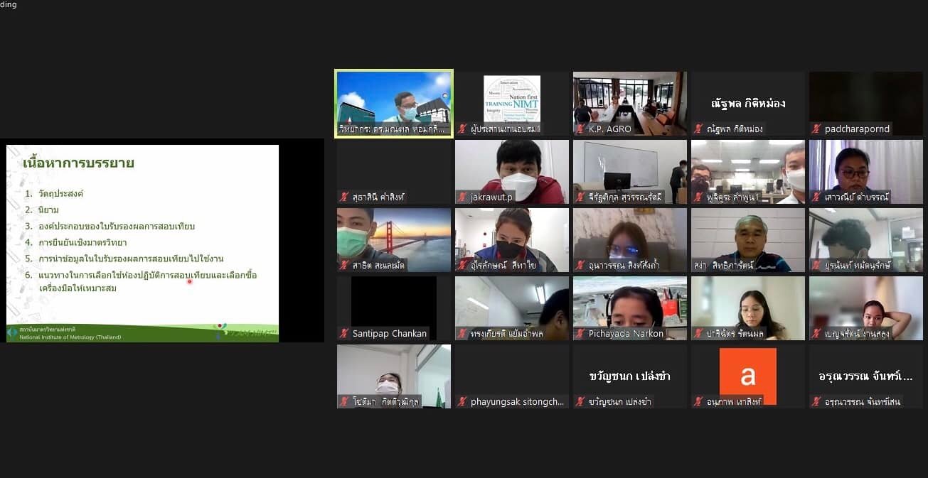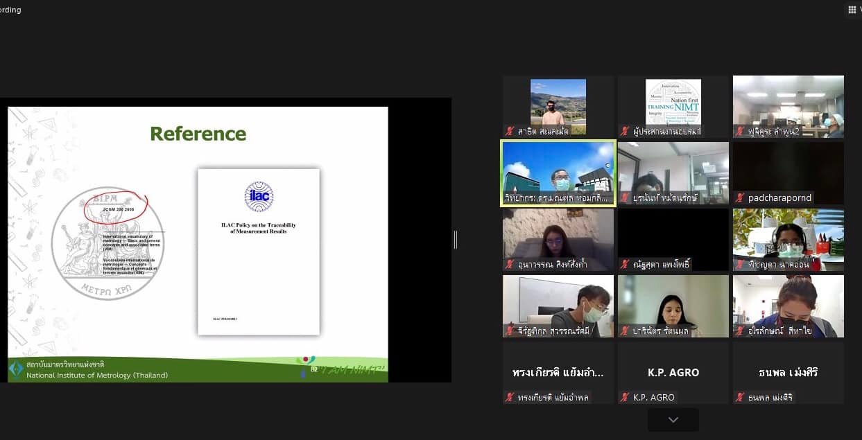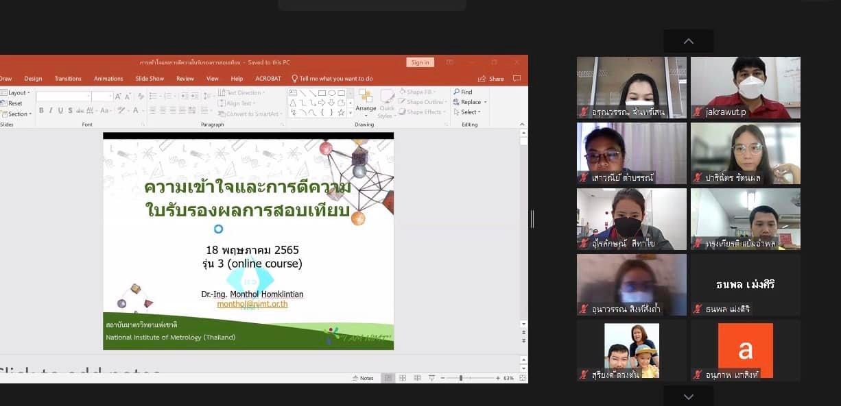 ส่วนฝึกอบรม กลุ่มงานพัฒนาธุรกิจ ฝ่ายนโยบายและยุทธศาสตร์ จัดการอบรมหลักสูตรมาตรวิทยาประจำปี 2565 ในรูปแบบออนไลน์ หัวข้อ “ ความเข้าใจและการตีความใบรับรองผลการสอบเทียบ รุ่น 3” ที่เป็นหลักสูตรที่เหมาะสำหรับผู้ตรวจประเมินระบบคุณภาพ ISO ผู้รับผิดชอบด้านระบบคุณภาพและเครื่องมือวัด และเจ้าหน้าที่ทดสอบและสอบเทียบมาตรฐานเครื่องมือวัด บรรยายโดย ดร.มณฑล หอมกลิ่นเทียน นักมาตรวิทยาชำนาญการพิเศษ รักษาการหัวหน้ากลุ่มงานมาตรฐานปฐมภูมิไฟฟ้า เวลาและความถี่ ฝ่ายมาตรวิทยาไฟฟ้า ทั้งนี้เพื่อให้ผู้เข้าอบรมมีความรู้ความเข้าใจและทราบถึงองค์ประกอบสำคัญในใบรายงานการสอบเทียบ และตระหนักถึงความสำคัญของใบรายงานผลการสอบเทียบเครื่องมือวัด สามารถอธิบายนิยามศัพท์ทางมาตรวิทยาที่ปรากฎในใบรับรองการสอบเทียบได้อย่างถูกต้อง พร้อมทั้งสามารถนำข้อมูลในใบรายงานการสอบเทียบไปใช้ได้อย่างถูกต้อง รวมไปถึงการมีองค์ความรู้ในการเลือกใช้บริการห้องปฏิบัติการสอบเทียบได้อย่างถูกต้องต่อไป ณ ห้องประชุมชั้น 3 อาคารพัฒนามาตรฐานการวัดเพื่อรองรับการพัฒนาระบบราง (มว.) จ.ปทุมธานี