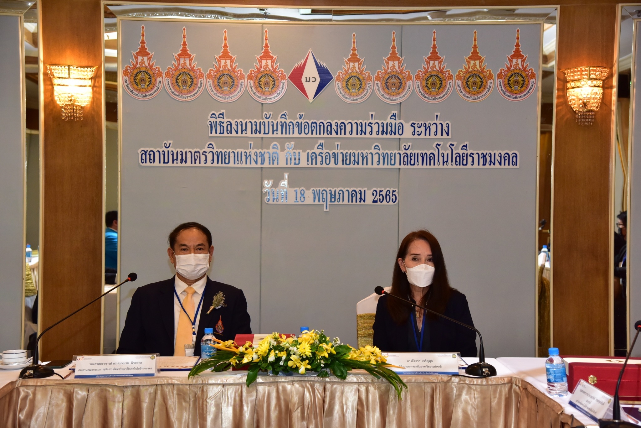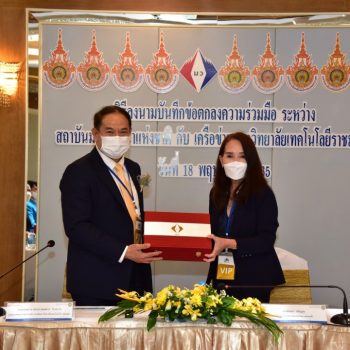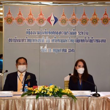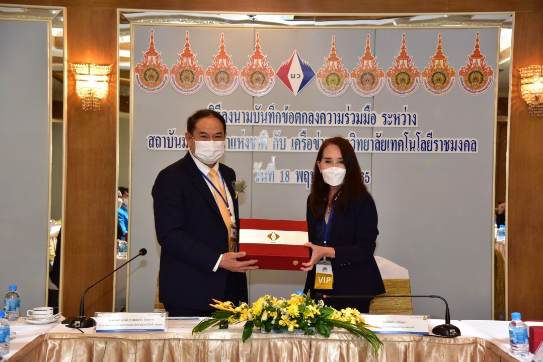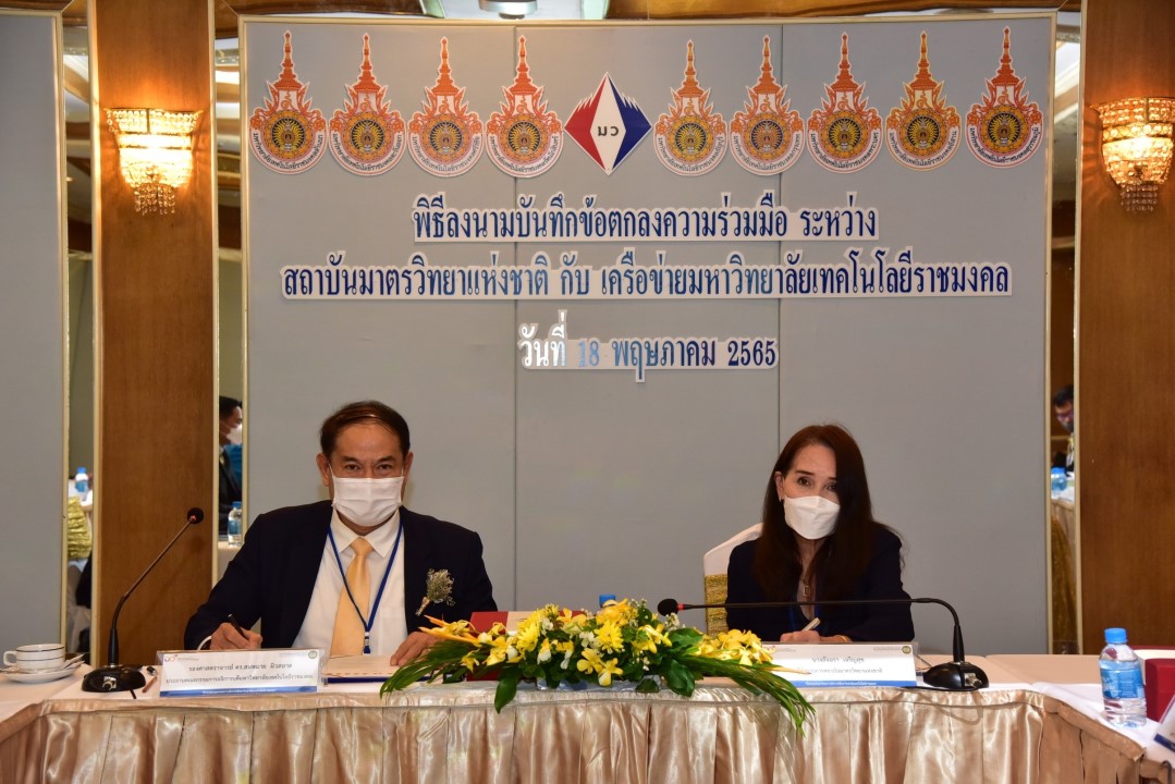 นางอัจฉรา เจริญสุข ผู้อำนวยการ มว. และ เครือข่ายมหาวิทยาลัยเทคโนโลยีราชมงคล นำโดย รศ.ดร.สมหมาย ผิวสอาด อธิการบดีมหาวิทยาลัยเทคโนโลยีราชมงคลธัญบุรี ประธานคณะกรรมการอธิการบดีมหาวิทยาลัยเทคโนโลยีราชมงคล และอธิการบดีมหาวิทยาลัยราชมงคลในเครื่อข่าย ร่วมลงนามในบันทึกข้อตกลงว่าด้วยความร่วมมือเพื่อการพัฒนาระบบมาตรวิทยา ระหว่าง สถาบันมาตรวิทยาแห่งชาติ (มว.) กับ เครือข่ายมหาวิทยาลัยเทคโนโลยีราชมงคล ทั้ง 9 แห่ง ได้แก่ 1.มหาวิทยาลัยเทคโนโลยีราชมงคลธัญบุรี 2.มหาวิทยาลัยเทคโนโลยีราชมงคลกรุงเทพ 3.มหาวิทยาลัยเทคโนโลยีราชมงคลตะวันออก 4.มหาวิทยาลัยเทคโนโลยีราชมงคลพระนคร 5.มหาวิทยาลัยเทคโนโลยีราชมงคลรัตนโกสินทร์ 6. มหาวิทยาลัยเทคโนโลยีราชมงคลล้านนา 7.มหาวิทยาลัยเทคโนโลยีราชมงคลศรีวิชัย 8.มหาวิทยาลัยเทคโนโลยีราชมงคลสุวรรณภูมิ และ 9.มหาวิทยาลัยเทคโนโลยีราชมงคลอีสาน โดยมีผู้บริหาร และเจ้าหน้าที่ของหน่วยงาน ร่วมลงนามและเป็นสักขีพยานในพิธีลงนามดังกล่าว ณ โรงแรมรอยัล คลิฟ แกรนด์ โฮเต็ล จ.ชลบุรี