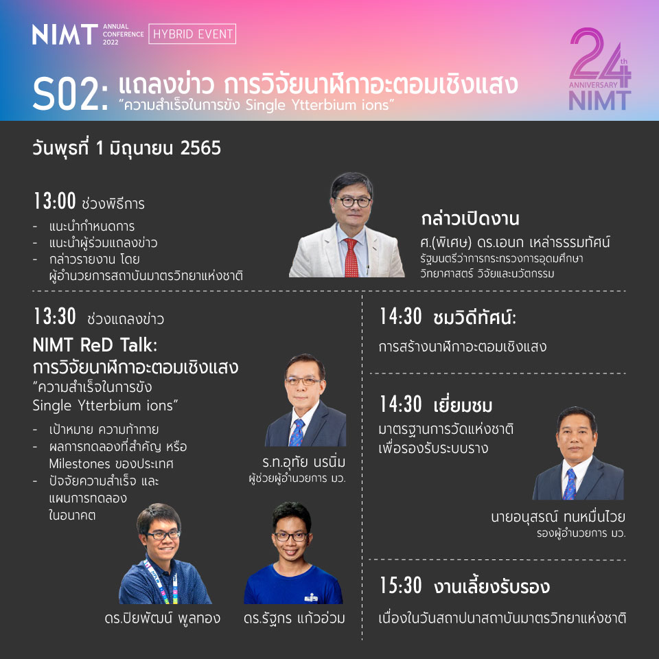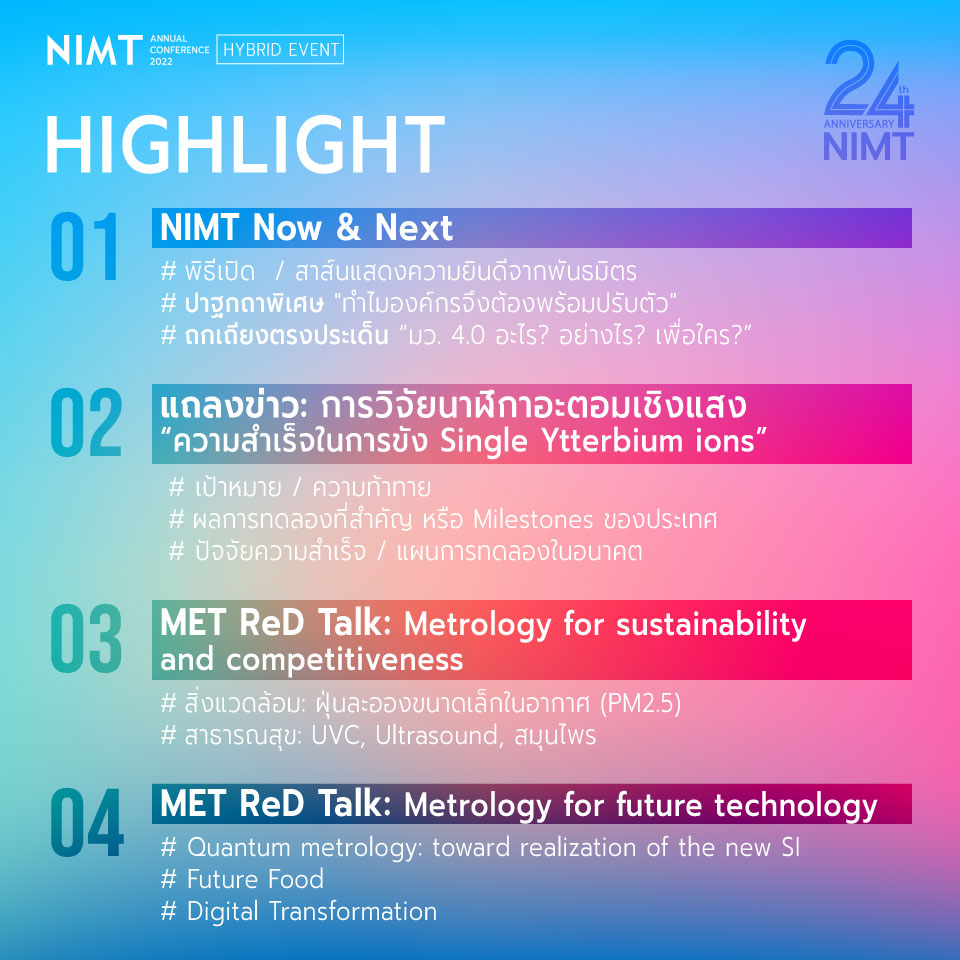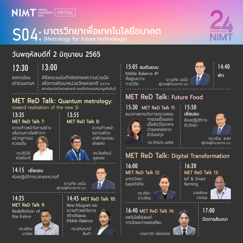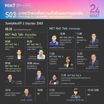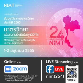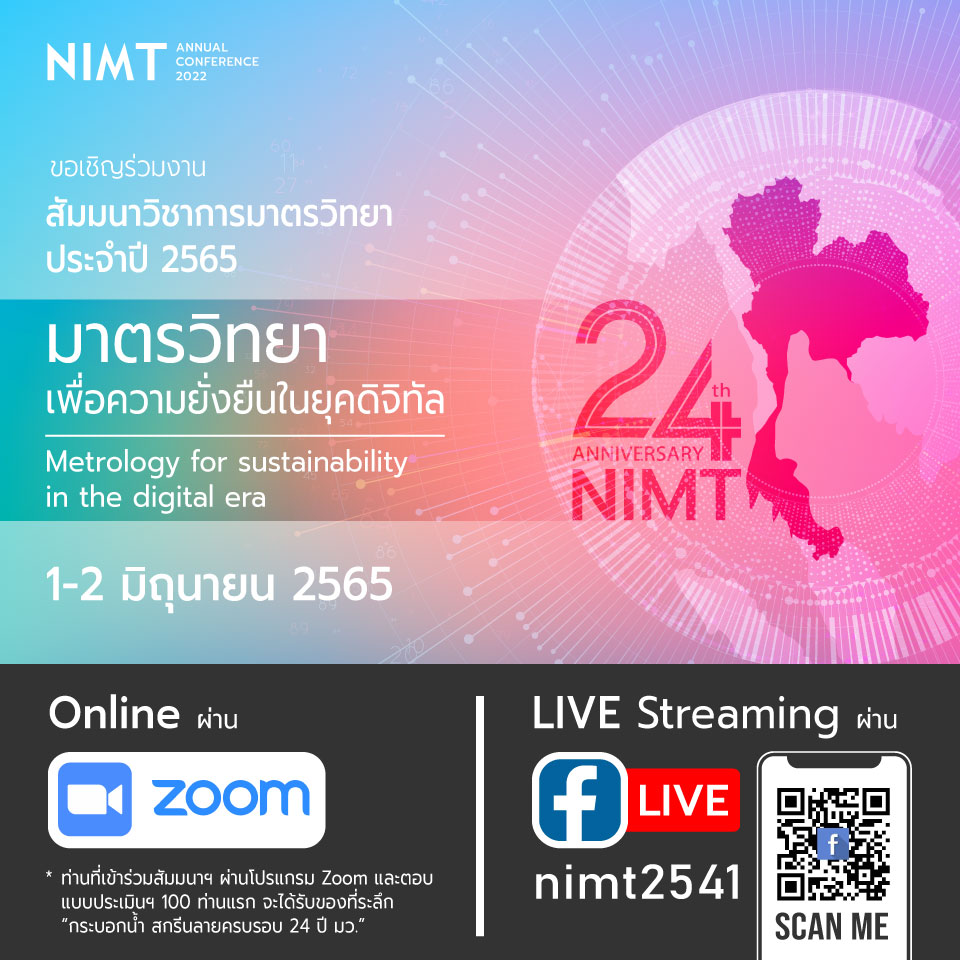สถาบันมาตรวิทยาแห่งชาติ ขอเชิญชวนผู้สนใจเข้าร่วมงาน สัมมนาวิชาการมาตรวิทยา ประจำปี 2565 (NIMT Annual Conference 2022) ภายใต้แนวคิด #มาตรวิทยาเพื่อความยั่งยืนในยุคดิจิทัล (Metrology for sustainability in the digital era) ระหว่างวันที่ 1 – 2 มิถุนายน 2565 ผ่านทางโปรแกรม ZOOM และ Facebook LIVE (nimt2541)