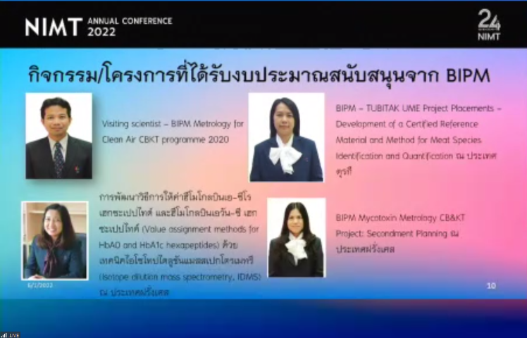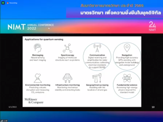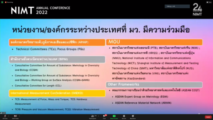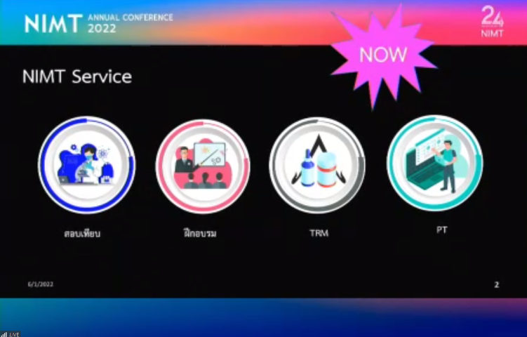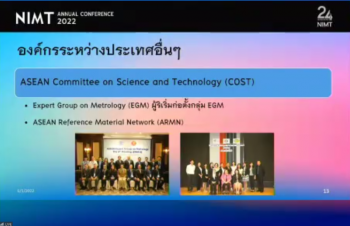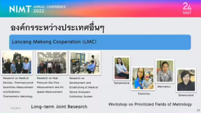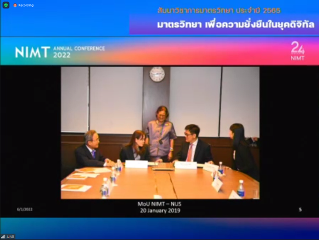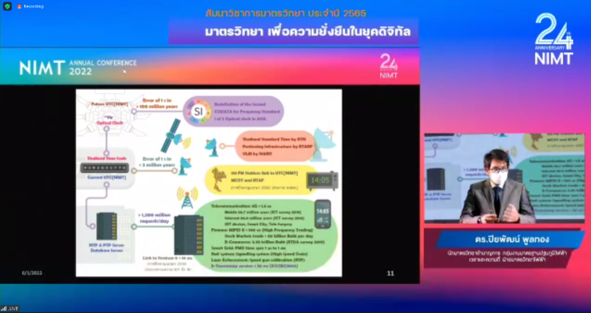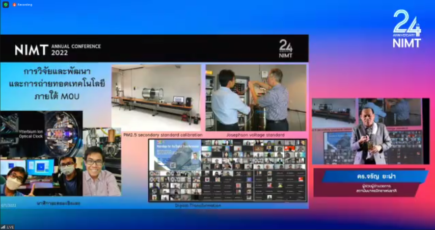 1 มิถุนายน 2565 ถือเป็นวันครบรอบ 24 ปีแห่งการสถาปนาสถาบันมาตรวิทยาแห่งชาติ (มว.) กระทรวงการศึกษา วิทยาศาสตร์ วิจัยและนวัตกรรม (อว.) ในการนี้ มว. เป็นเจ้าภาพจัดงานสัมมนาวิชาการประจำปี 2565 ภายใต้หัวข้อ มาตรวิทยาเพื่อความยั่งยืนในยุคดิจิทัล (Metrology for sustainability in the digital era) โดยได้แบ่งกิจกรรมในช่วงเช้า : มว. ตอนนี้และตอนต่อไป (NIMT: now & next) เป็นพิธีเปิดงานสัมมนาโดยนางอัจฉรา เจริญสุข ผู้อำนวยการ มว. สาส์นแสดงความยินดีจากพันธมิตร ต่อด้วยปาฐกถาพิเศษ “ทำไมองค์กรจึงต้องพร้อมปรับตัว” โดย ดร.ดนัยรัฐ ธนบดีธรรมจารี, Digital Transformation and Enterprise Architecture ตามด้วย “ถกเถียงตรงประเด็น” หัวข้อ มว. 4.0 อะไร? อย่างไร? เพื่อใคร? โดยผู้จัดการฝ่ายบริหารกลาง นายเจนณิพัฒน์ ยะอนันต์ และผู้จัดการฝ่ายนโยบายและยุทธศาสตร์ นางสาวพริมา เกิดอุดม ดำเนินรายการโดย ดร.นฤดม นวลขาว หัวหน้ากลุ่มงานพัฒนาธุรกิจ และกิจกรรมก่อนจะไปพักรับประทานอาหารกลางวันคือ Op-Ed Talk 1: บริการรูปแบบใหม่ โดย ดร.นฤดม นวลขาว และ Op-Ed 2: การพัฒนาบทบาทด้านความร่วมมือระหว่างประเทศ โดยดร.จรัญ ยะฝา ผู้ช่วยผู้อำนวยการ มว.