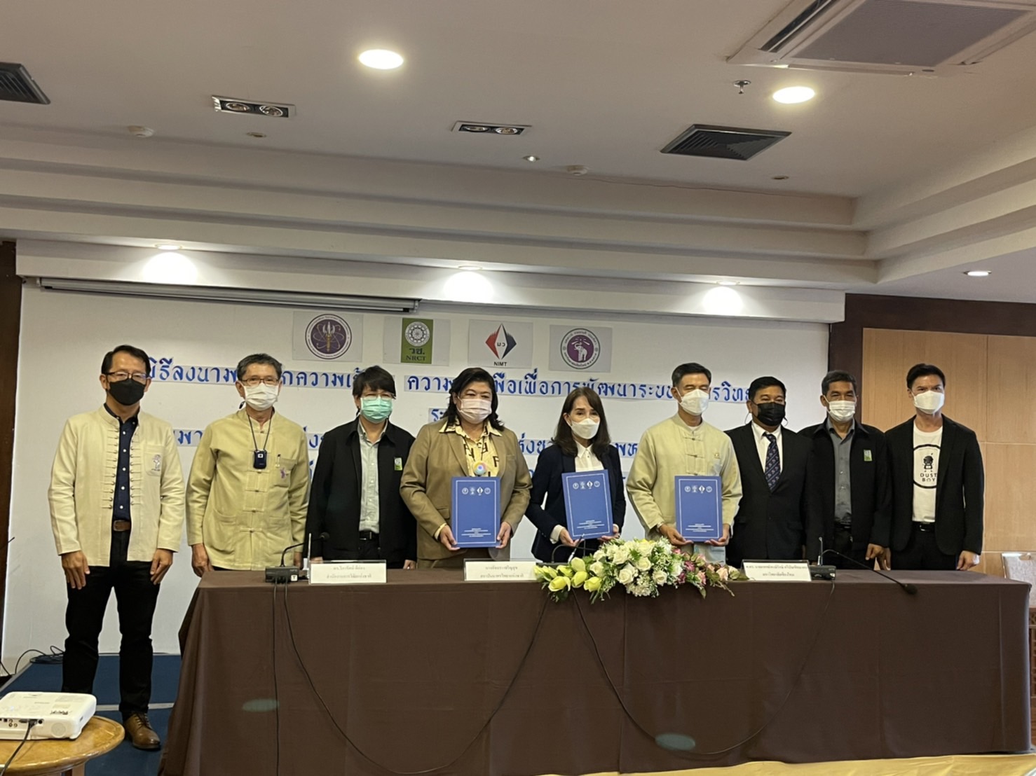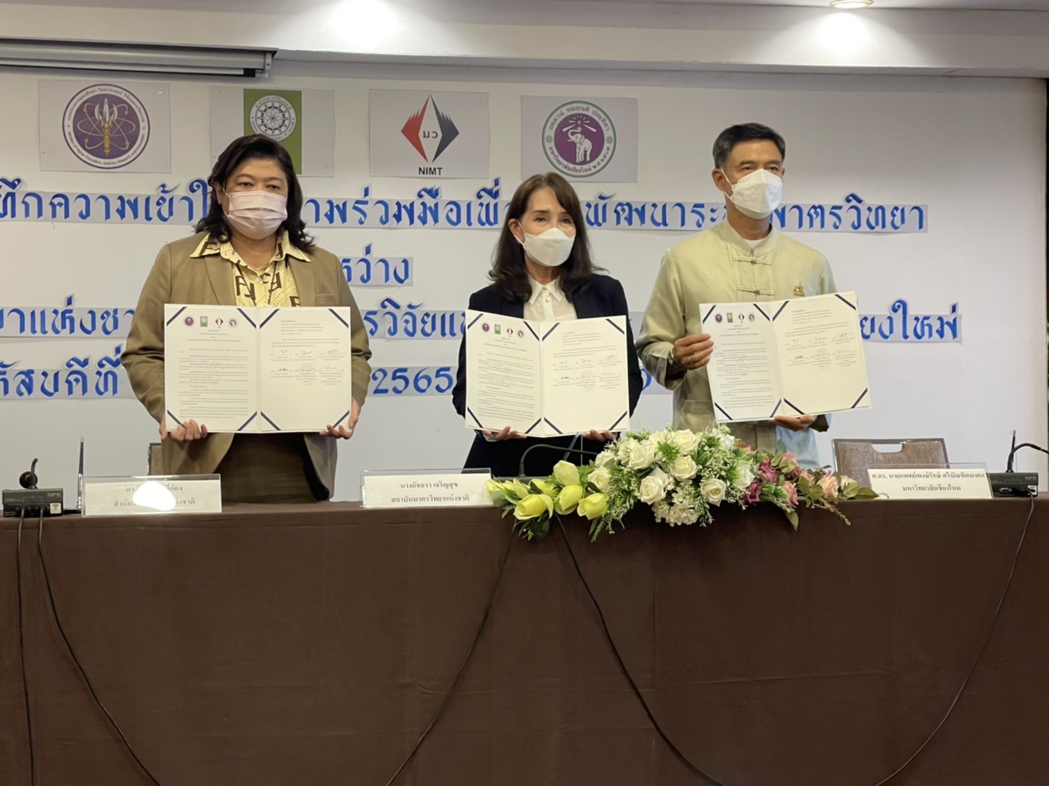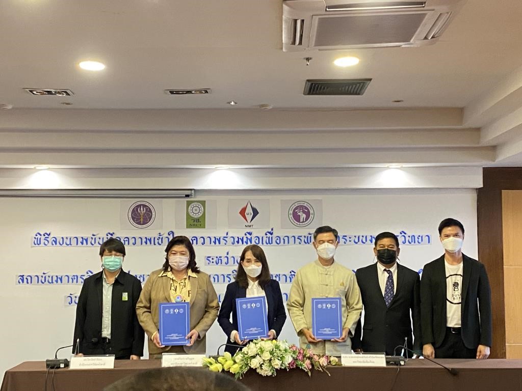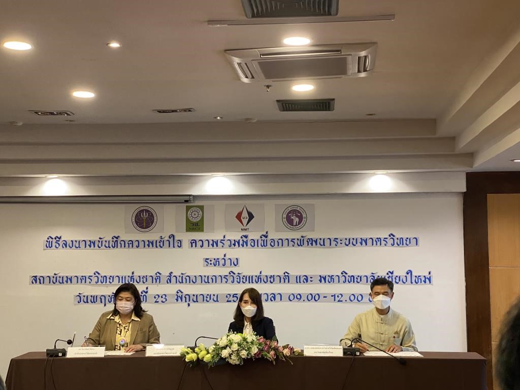 เมื่อวันที่ 23 มิถุนายน 2565 นางอัจฉรา เจริญสุข ผู้อํานวยการสถาบันมาตรวิทยาแห่งชาติ ดร.วิภารัตน์ ดีอ่อง ผู้อํานวยการสํานักการวิจัยแห่งชาติ พร้อมด้วย ศาสตราจารย์คลินิก นายแพทย์นิเวศน์ นันทจิต อธิการบดีมหาวิทยาลัยเชียงใหม่ ได้ลงนามบันทึกความเข้าใจความร่วมมือ (MOU) เพื่อพัฒนาระบบมาตรวิทยาร่วมกัน โดยมีวัตถุประสงค์เพื่อร่วมกันจัดกิจกรรมทางวิชาการเพื่อพัฒนาหลักสูตรระยะสั้นหรือหลักสูตรการอบรมด้านมาตรวิทยา เพื่อร่วมกันวิจัยและพัฒนาเทคโนโลยีการวัด เพื่อสนับสนุนการวิเคราะห์ ทดสอบ และสอบเทียบ ตลอดจนการถ่ายทอดเทคโนโลยีดังกล่าวให้กับภาคการศึกษาและอุตสาหกรรม