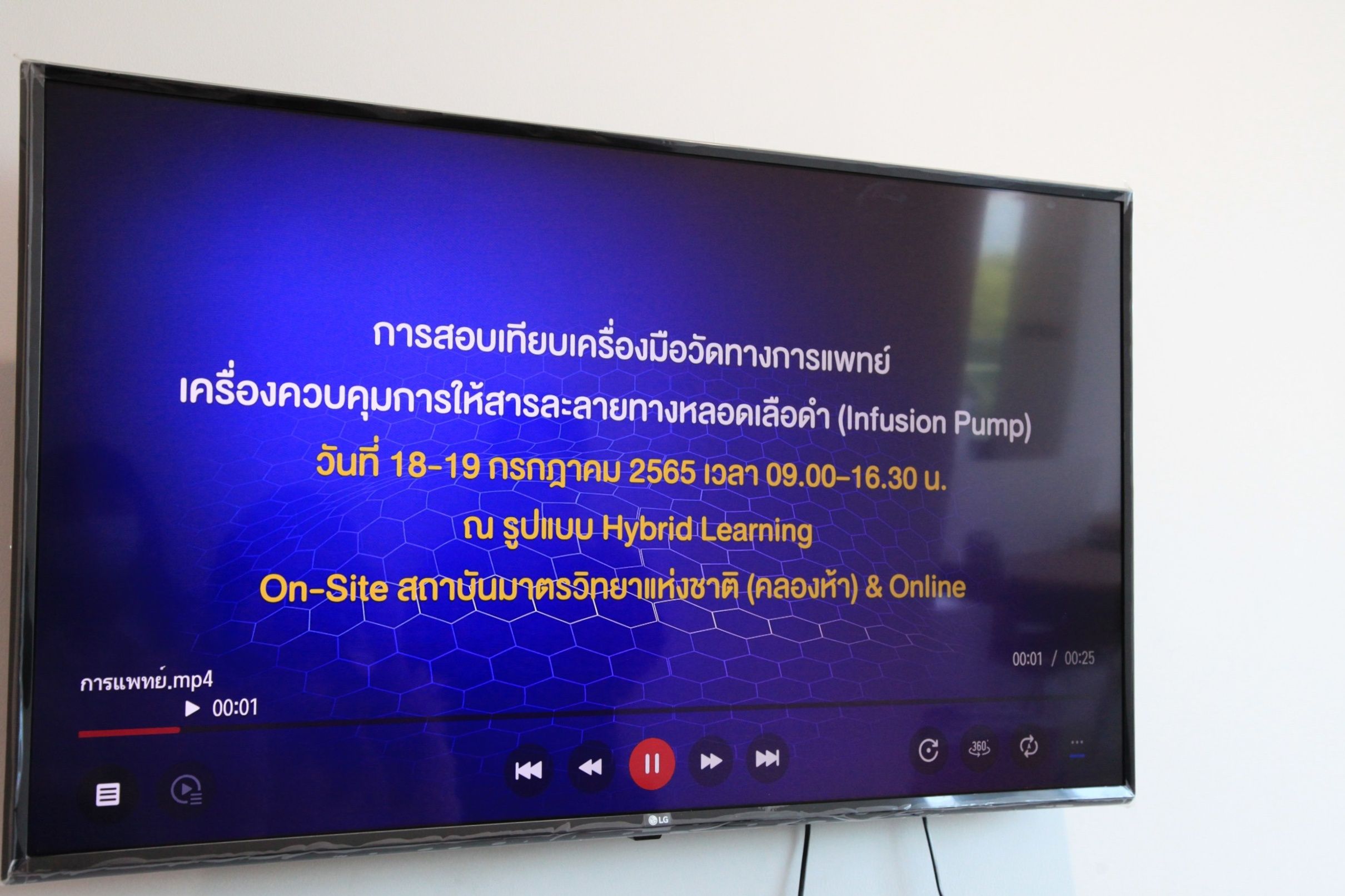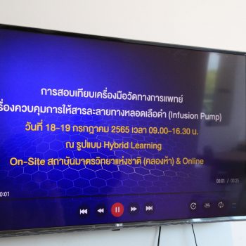ส่วนฝึกอบรม กลุ่มงานพัฒนาธุรกิจ ฝ่ายนโยบายและยุทธศาสตร์ จัดการอบรมหลักสูตรมาตรวิทยาประจำปี 2565 ในหัวข้อ “การสอบเทียบเครื่องมือวัดทางการแพทย์ เครื่องควบคุมการให้สารละลายทางหลอดเลือดดำ (Infusion Pump)” ซึ่งเป็นหลักสูตรที่เหมาะสำหรับ ผู้ที่ปฏิบัติงานเกี่ยวข้องกับการดูแลเครื่องมือวัดทางการแพทย์ และผู้ที่สนใจทั่วไป เพื่อให้ผู้เข้ารับการอบรมสามารถเลือกใช้เครื่องมือวัดอัตราการไหลได้อย่างเหมาะสม มีความเข้าใจเกี่ยวกับค่า Correction และค่าความไม่แน่นอนของการวัด และสามารถสอบเทียบเครื่อง Infusion Pump ได้ตามวิธีมาตรฐาน และสามารถนำใบรายงานผลการสอบเทียบไปใช้ได้อย่างถูกต้อง บรรยายโดย ดร.ธีรารักษ์ ชินารักษ์ นักมาตรวิทยาชำนาญการพิเศษ และ ดร.พัชรพล กอกิตรัตนกุล นักมาตรวิทยาปฏิบัติการ กลุ่มงานกลศาสตร์ของไหล ฝ่ายมาตรวิทยาเชิงกล โดยผู้เข้ารับการอบรมจะได้เรียนรู้เนื้อหาทั้งภาคทฤษฎี และภาคปฏิบัติ อาทิ ความรู้เบื้องต้นของการสอบเทียบ Infusion Pump การทดลองวัดการไหลเบื้องต้น การหา Correction ความรู้เบื้องต้นเกี่ยวกับการคำนวณความไม่แน่นอนในการวัด และขั้นตอนวิธีการสอบเทียบเครื่อง Infusion Pump การคำนวณค่าที่เกี่ยวกับการสอบเทียบ และการนำผลจากใบรายงานการสอบเทียบไปใช้งาน เพื่อให้สามารถนำความรู้ที่ได้รับจากการอบรมไปประยุกต์ใช้ในการปฏิบัติงานได้จริง ณ ห้องประชุมชั้น 3 อาคารพัฒนามาตรฐานการวัดเพื่อรองรับการพัฒนาระบบราง (มว.) จ.ปทุมธานี