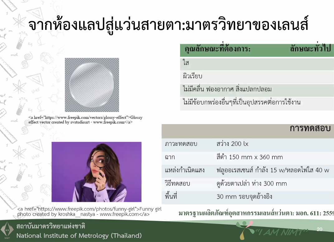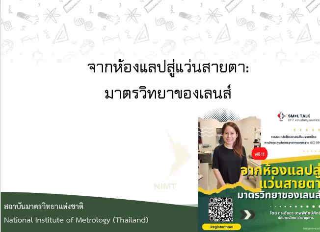 ฝ่ายมาตรวิทยามิติ สถาบันมาตรวิทยาแห่งชาติ มว. ในฐานะผู้รับผิดชอบโครงการในส่วนของกิจกรรมพัฒนาผู้ประกอบการวิสาหกิจขนาดกลางและขนาดย่อม (SMEs) สู่อุตสาหกรรม 4.0 ด้วยเทคโนโลยีมาตรวิทยา จัดบรรยายวิชาการออนไลน์สำหรับผู้ประกอบการ โดยเฉพาะผู้ประกอบการในกลุ่มอุตสาหกรรม S-curve “ความสำคัญของการวัด ตอนที่ 7 : จากห้องแลปสู่ แว่นสายตา : มาตรวิทยาของเลนส์ บรรยายให้ความรู้แก่ผู้สนใจโดย ดร.อัชยา เทพพิทักษ์ศักดิ์ นักมาตรวิทยา กลุ่มงานมาตรวิทยานาโน ฝ่ายมาตรวิทยามิติ โดยมีวัตถุประสงค์เพื่อเผยแพร่ความรู้เกี่ยวกับการสอบกลับได้ของเลนส์ในประเทศไทย การวัดชุดเลนส์มาตรฐานตาม ISO 9342 พร้อมทั้งตอบข้อข้องใจ สงสัยเกี่ยวกับเรื่องดังกล่าวให้แก่ผู้สนใจรับฟังการบรรยายในครั้งนี้ ณ สถาบันมาตรวิทยาแห่งชาติ (มว.) จ.ปทุมธานี