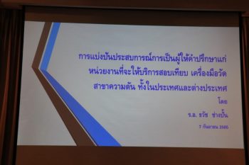 - หัวข้อ “การแบ่งปันประสบการณ์ การเป็นผู้ให้คำปรึกษาแก่หน่วยงานที่ให้บริการสอบเทียบเครื่องมือวัดสาขาความดัน ทั้งในประเทศและต่างประเทศ”