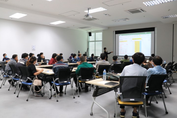 - บรรยากาศในการสาธิตวิธีการคำนวณผลการสอบเทียบเครื่องมือวัดความดันและการประเมินค่าความไม่แน่นอน